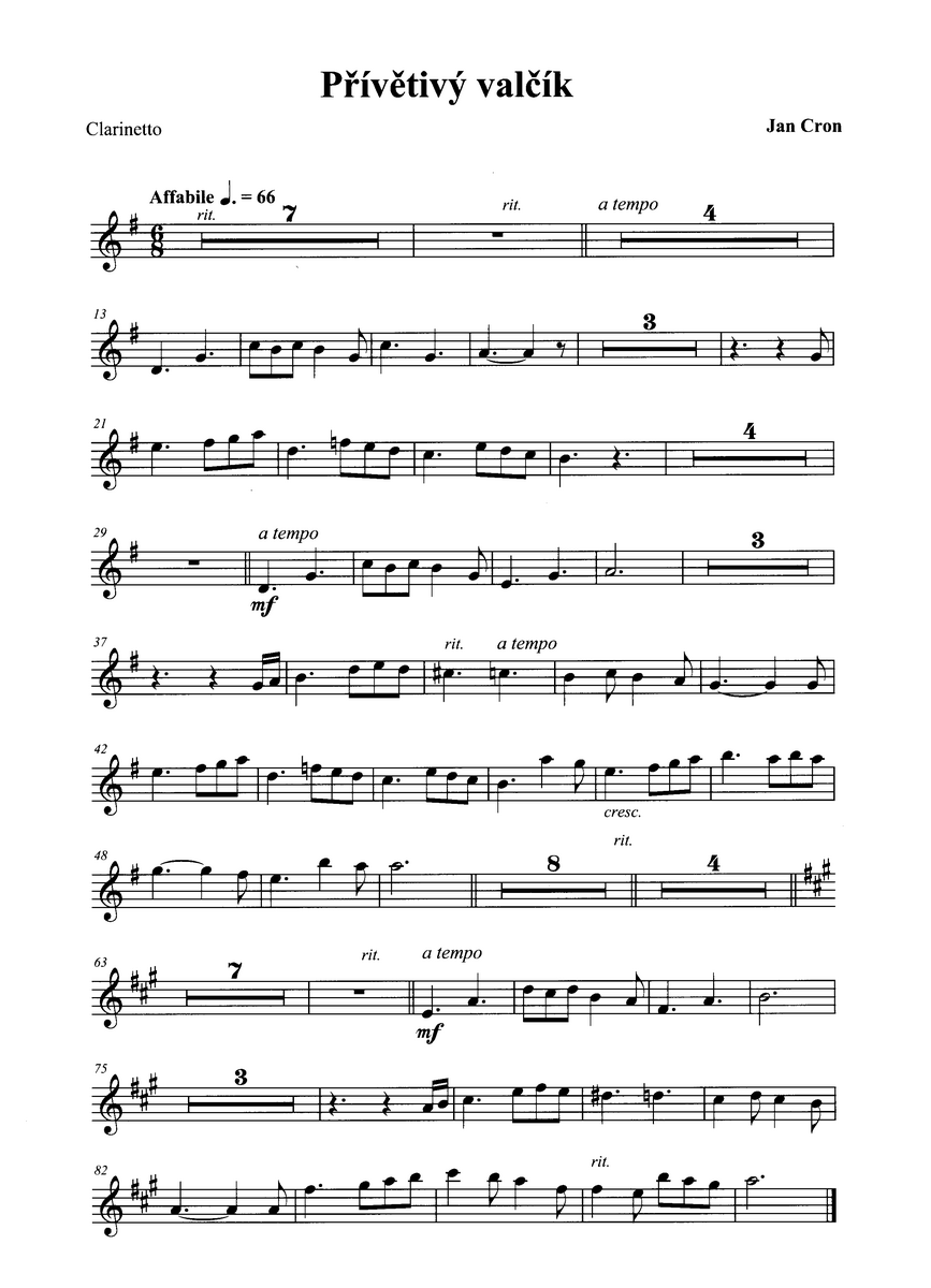 Tvorbučeského skladatele Jana Crona můžeme vnímat jako hudbu nekonvenční, spojující moderní prvky s klasickými, instrumentálně i harmonicky bohatou. Přívětivý valčík od Jana Crona Vám nabízí příjemnou skladbu pro malý hudební soubor ve složení flétna, klarinet, piano pro čtyři ruce a tamburínu. Sešit obsahuje hrací partituru plus samostatné party pro flétnu a klarinet.