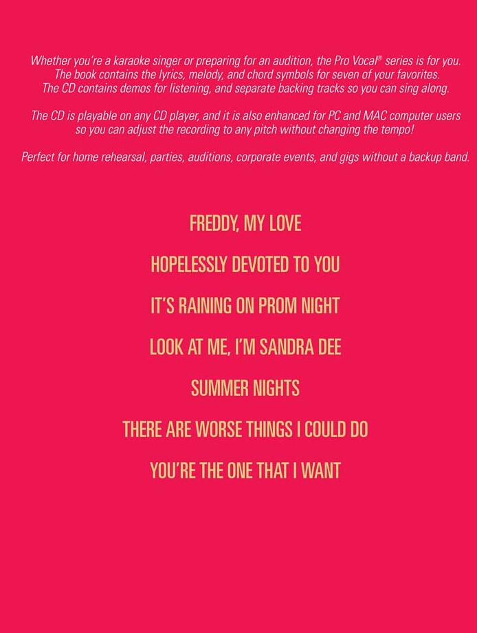 Nový a vynikající titul pro všechny zpívající dívky, ženy a dámy. Výběr písní z muzikálu GREASE (Pomáda) s doprovodem na přiloženém CD. Každá skladba je zde nahrána dvakrát. Poprvé tak, jak zní a to včetně zpěvu a podruhé pouze skvělý doprovod pro Váš přednes. Navíc přiložené CD obsahuje program pro PC a MAC, na kterém můžete upravovat rychlost skladby podle Vašich představ. Neuvěřitelné povedený titul !!!