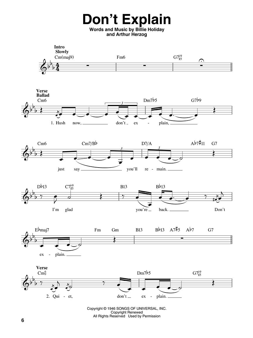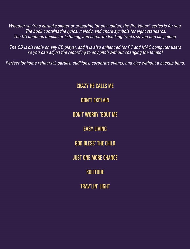 Série PRO VOCAL s podtitulem BETTER THAN KARAOKE (Lepší než karaoke) je velmiúspěšná série titulů zaměřená především pro zpěváky (ženy i muže). Skladby jsou zde nahrány s výborným profesionálním doprovodem na přiloženém CD. Každá skladba je zde nahrána dvakrát. Poprvé tak, jak zní a to včetně zpěvu a podruhé pouze skvělý doprovod pro Váš přednes. Navíc přiložené CD obsahuje program pro PC a MAC, na kterém můžete upravovat rychlostskladby podle Vašich představ. Všechny skladby v sešitě jsou v úpravě melodická linka, akordové značky a text. Tento sešit Vám nabízí skvělý výběr výborných jazzových evergreenů, které měla ve svém repertoáru a nazpívala jedna z velmi známých a úspěšných jazzových zpěvačekBillie Holiday (1915-1959).