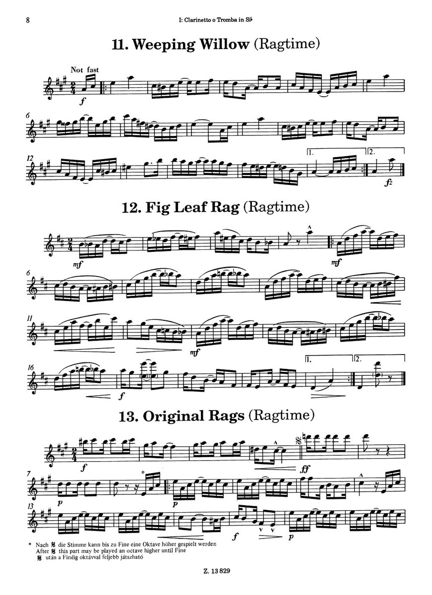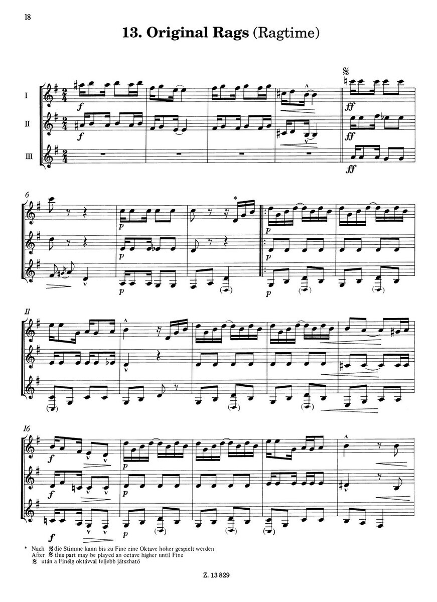 Zajímavý titul obsahující 18 ragtimů od Scott Joplin (1868 - 1917) v úpravě pro komorní soubor (houslový, dechový nebo kombinovaný) . Titul obsahuje "hrací" parituru včetně všech rozepsaných hlasů - 1 - 3 clarinet, 2-3 viola, 2-3 fagot nebo violoncello a partitura je v C hlase jsou to hlasy 1-3 pro housle. Velmi povedený a variabilní titul !!!
