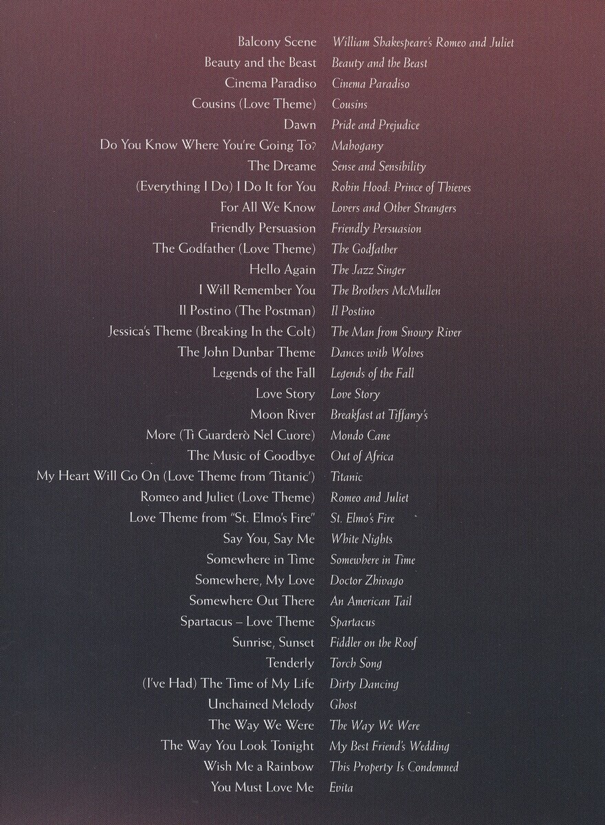 Balcony SceneBeauty And The BeastCinema ParadisoCousins (Love Theme)DawnDo You Know Where You're Going To?The Dreame(Everything I Do) I Do It For YouFor All We KnowFriendly PersuasionThe Godfather (Love Theme)Hello AgainI Will Remember YouIl Postino (The Postman)Jessica's Theme (Breaking In The Colt)The John Dunbar ThemeLegends Of The FallLove StoryMoon RiverMore (Ti Guarder? Nel Cuore)The Music Of GoodbyeMy Heart Will Go On (Love Theme From 'Titanic')Romeo And Juliet (Love Theme)Say You, Say MeSomewhere In TimeSomewhere, My LoveSomewhere Out ThereSpartacus - Love ThemeLove Theme From 'St. Elmo's Fire'Sunrise, SunsetTenderly(I've Had) The Time Of My LifeUnchained MelodyThe Way We WereThe Way You Look TonightWish Me A RainbowYou Must Love Me