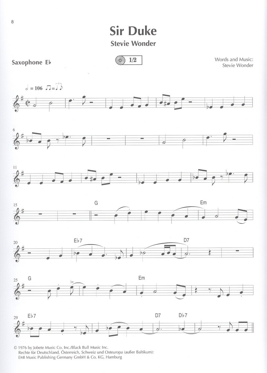 SAX PLUS ! - výborná série velmi dobře vybraných evergreenů se skvělým "živým" doprovodem na přiloženém CD. Na přiloženém CD je každá skladba nahrána dvakrát, jednou v plném znění a podruhé pouze doprovod pro Vaši hru. Každá skladba je napsána 2x. Jednou pro alto sax (Eb) a po druhépro tenor sax (Bb). Všechny skladby jsou doplněny akordovými značkami pro Vaši případnou improvizaci. Vynikající !!!