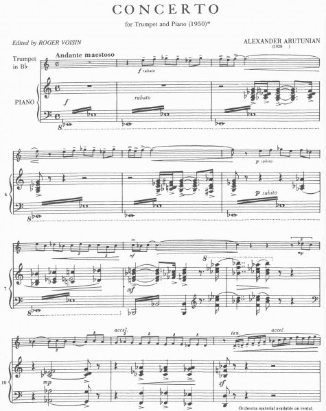 Koncert pro trumpetu a klavír od Alexander Grigorevich Arutiunian (1920-2012) , arménského skladatele a klavíristy. Sešit obsahuje klavírní doprovod plus samostatný part pro trumpetu.