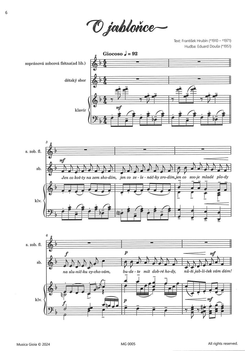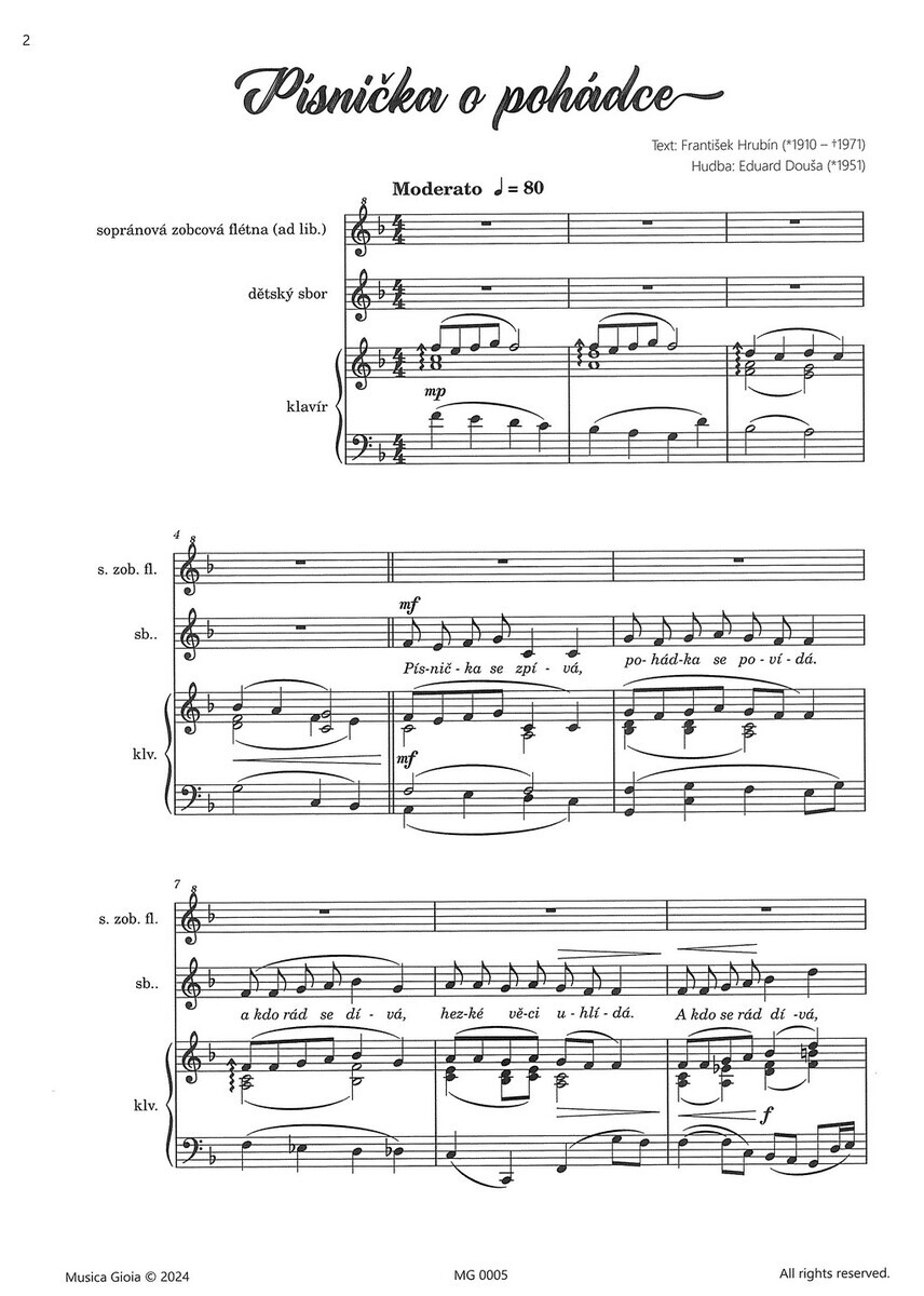 Cyklus tří písniček pro dětský sbor, sopránovou zobcovou flétnu a klavír.
