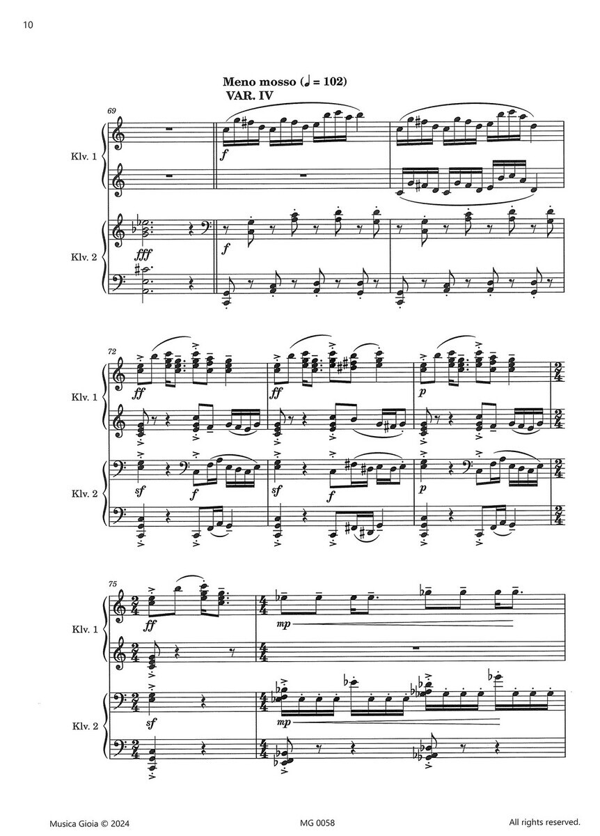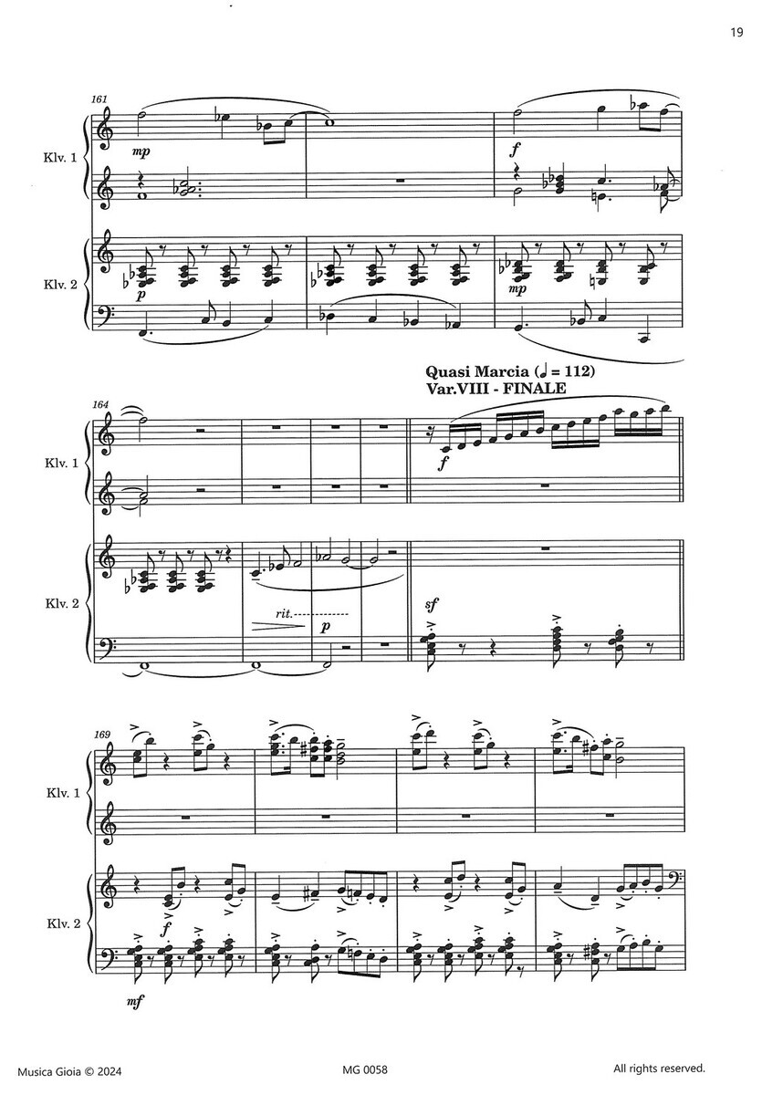 „Variace na moravské téma pro čtyřruční klavír“ je kompozice, která vychází z moravského folklóru a v následujících variacích prochází téma nejrůznějšími proměnami – od romantismu, přes jazzovou stylizaci až po technicky efektní závěr.