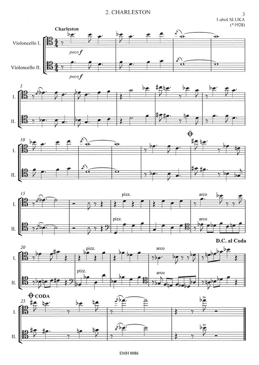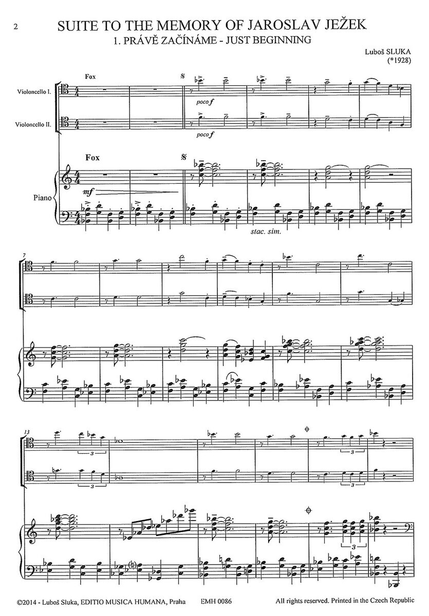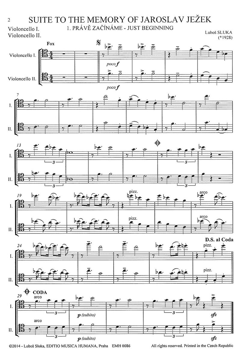 „Suite to the memory of Jaroslav Ježek“ je krásná suita o šesti větách pro dvě violoncella s doprovodem klavíru. Suitu napsal skladatel Luboš Sluka jako poctu Jaroslavu Ježkovi a je napsána v hudebním stylu jakým Ježek své skladby psal, tedy v rytmu jazzu, blues a swingu. Sešit obsahuje klavírní doprovod plus samostatně vložený part pro violoncella.
