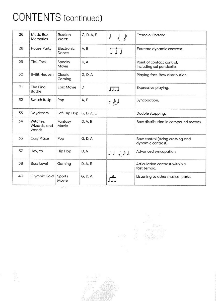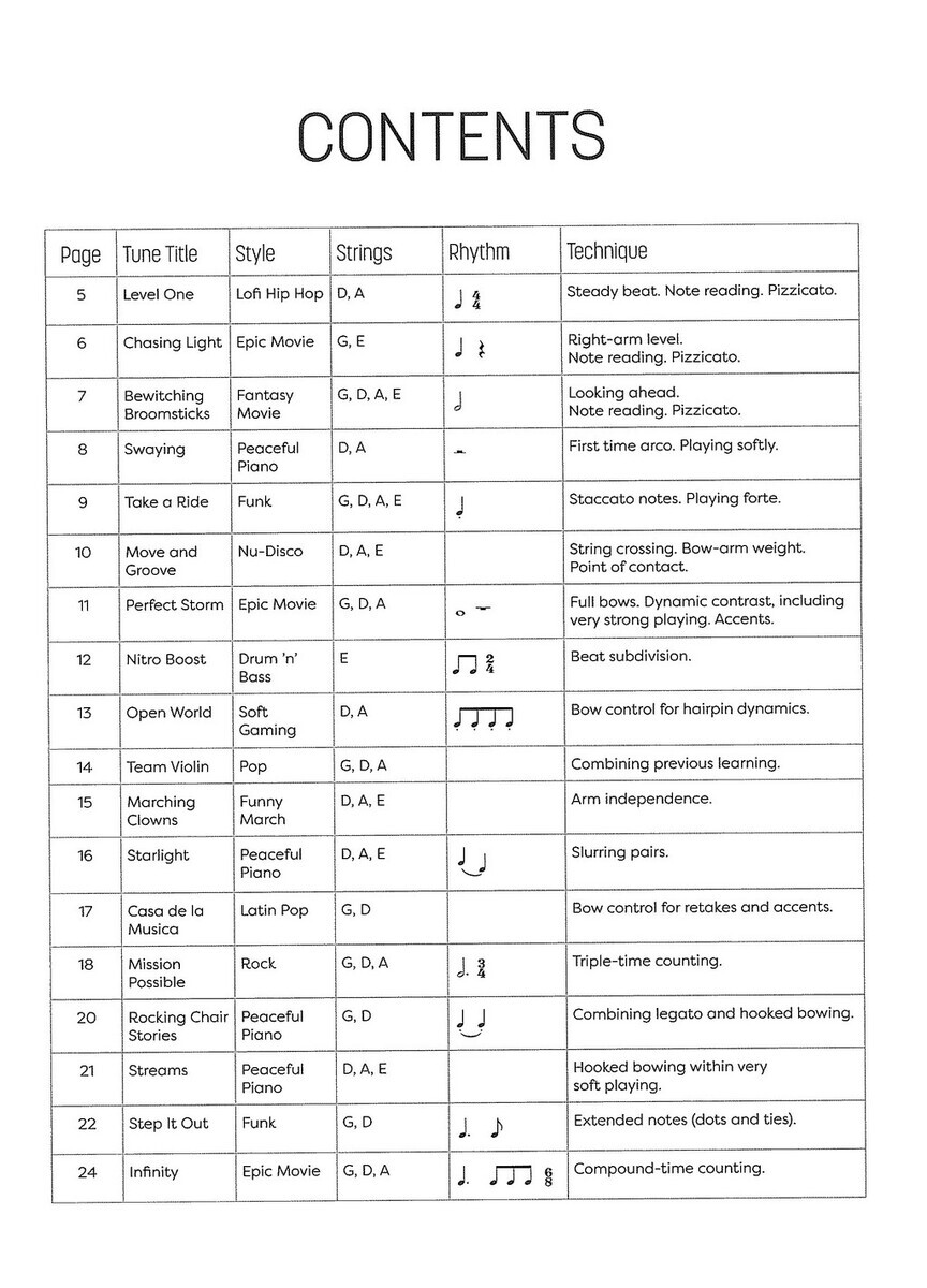 „Open String Tunes“ (Skladby na otevřených strunách) Vám přináší kolekci 30 drobných skladeb pro začínající houslisty. Skladby jsou v sešitě seřazeny podle obtížnosti a ke každé skladbě je k dispozici ke stažení zajímavý doprovod různých hudebních stylů. Součástí sešitu jsou internetové stránky vydavatele a unikátní kód, který Vám umožní přehrávat nebo stáhnout si nahrávky do počítače jak demo verze, tak samotného doprovodu a také klavírní doprovody ve formátu PDF k vytištění. Skladby v sešitě jsou napsány tak, aby poskytli úplným začátečníkům přednesové skladby, na který mohou být pyšní, a zároveň jim poskytli příležitost k rozvoji dovedností čtení not a houslové techniky.