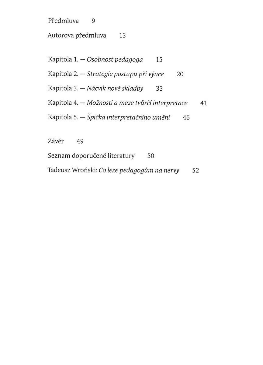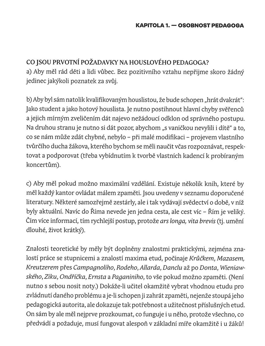Kniha vychází ze zkušeností a mnohaleté praxe autora jako pedagoga, interpreta a neúnavného propagátora dobré - zejména soudobé - hudby a správných postupů v oblasti houslové metodiky. Pojednává především o podstatných (ne-li nejdůležitějších) informacích, které by měli znát všichni, kdo se cítí být povoláni instruovat mládež v oboru hry houslové, případně nástrojové obecně. A to bez ohledu na věk adepta i na míru talentu, jímž je jedinec obdařen.
