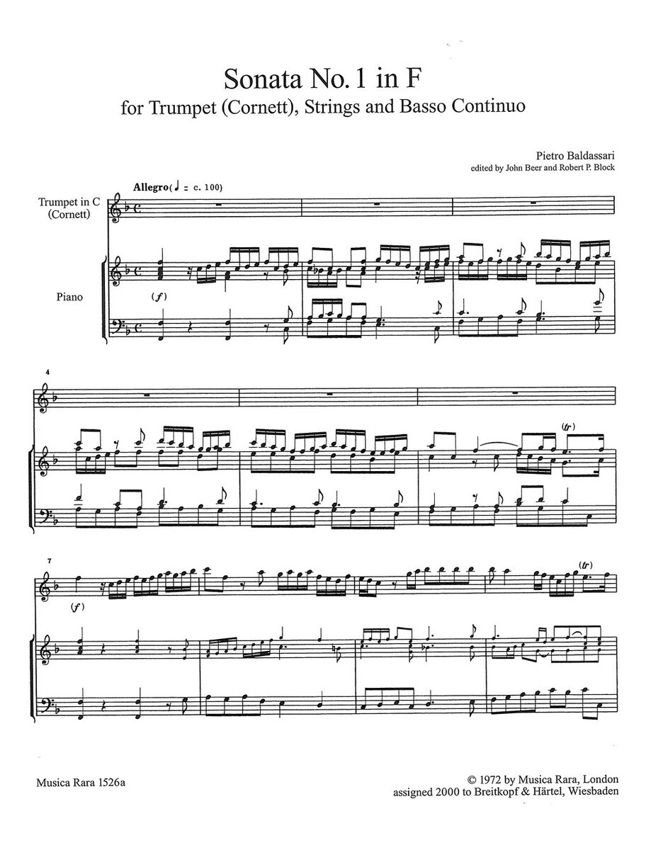 Sonata No.1 in F patří mezi nejznámější dochované skladby Baldassariho. Předkládané vydání vychází z kopie, která se dochovala ve vídeňské Národní knihovně. Pramen však není datován, ale přepokládá se, že skladba musela vzniknout někdy na začátku 18. století. Sonata je v originále napsána pro trumpetu (kornet), smyčce a basso continuo, nyní vám tuto skladbu nabízíme v úpravě pro C trumpetu (kornet) a klavír.