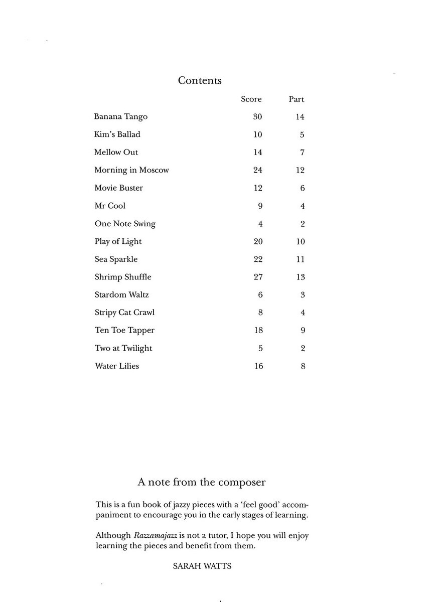 Razzamajazz je atraktivní sbírka originálních a zábavných skladeb s jazzovým nádechem pro začínající a mírně pokročilé hráče na fagot s doprovodem klavíru. Skladbičky začínají úplně od začátku, první písnička je pouze na jednom tónu a postupně se přidávají další až jich u poslední písničky zvládnete zahrát celých deset. Každý tón je zde zobrazený v notách a také jeho prstoklad na nástroji.