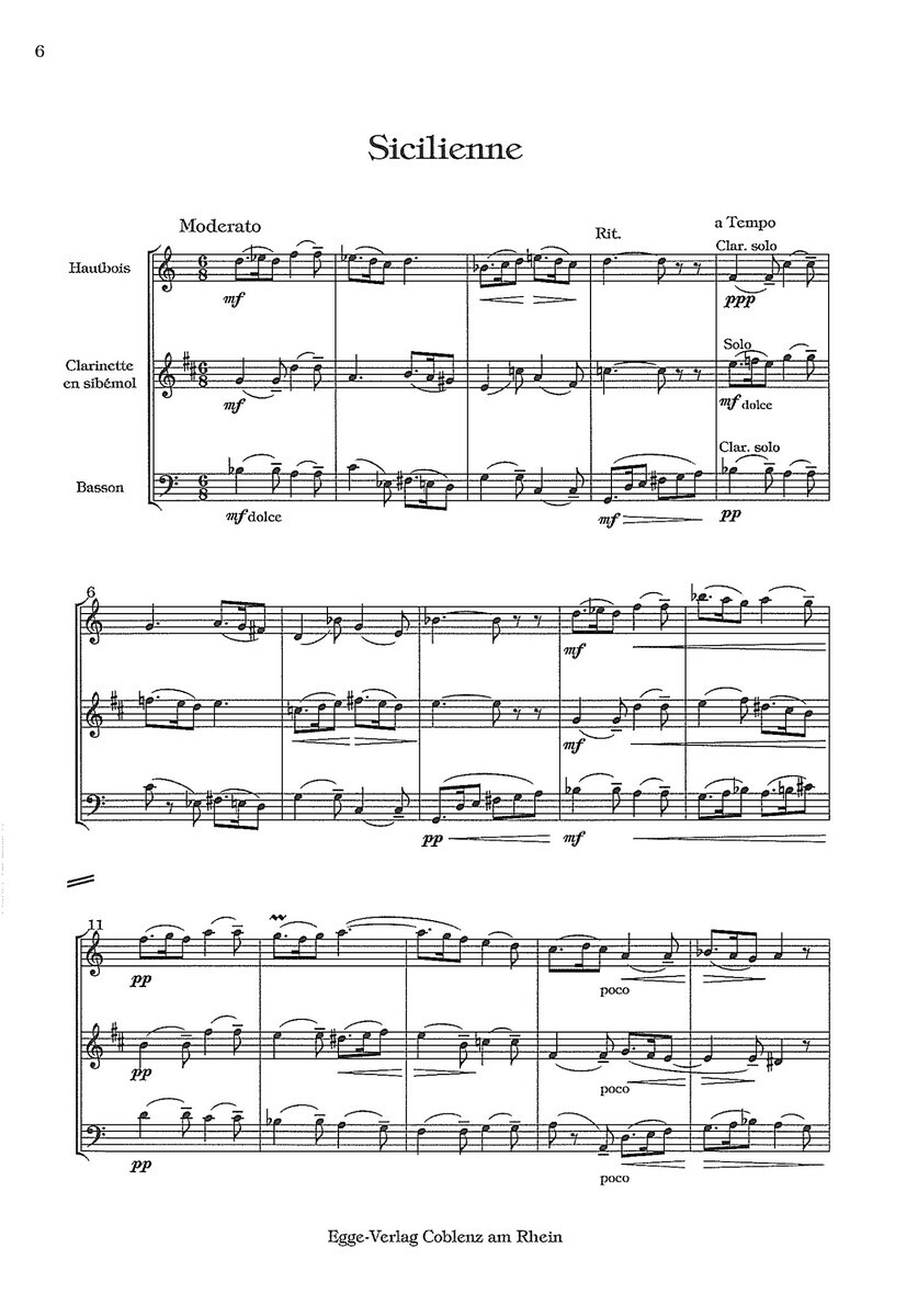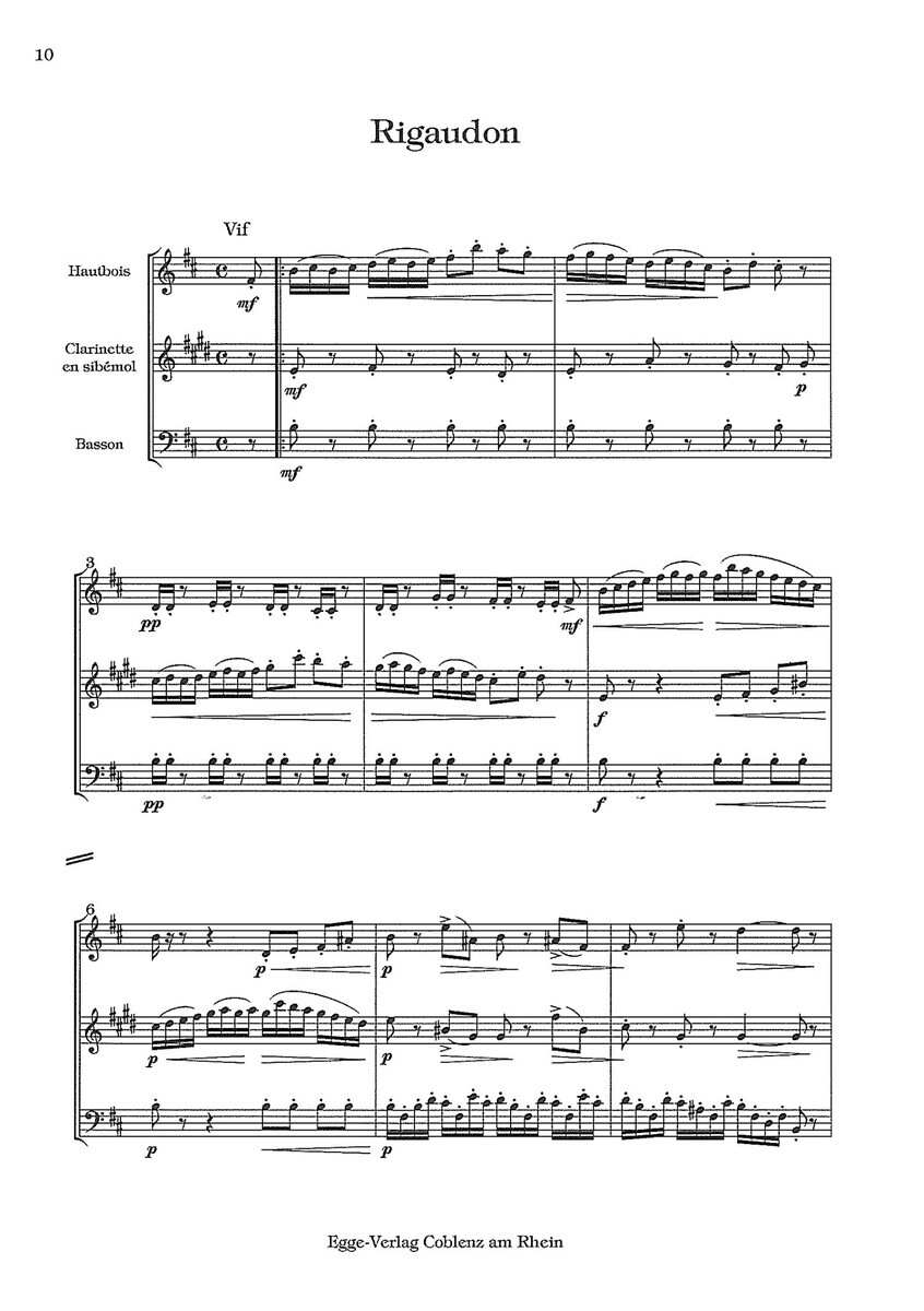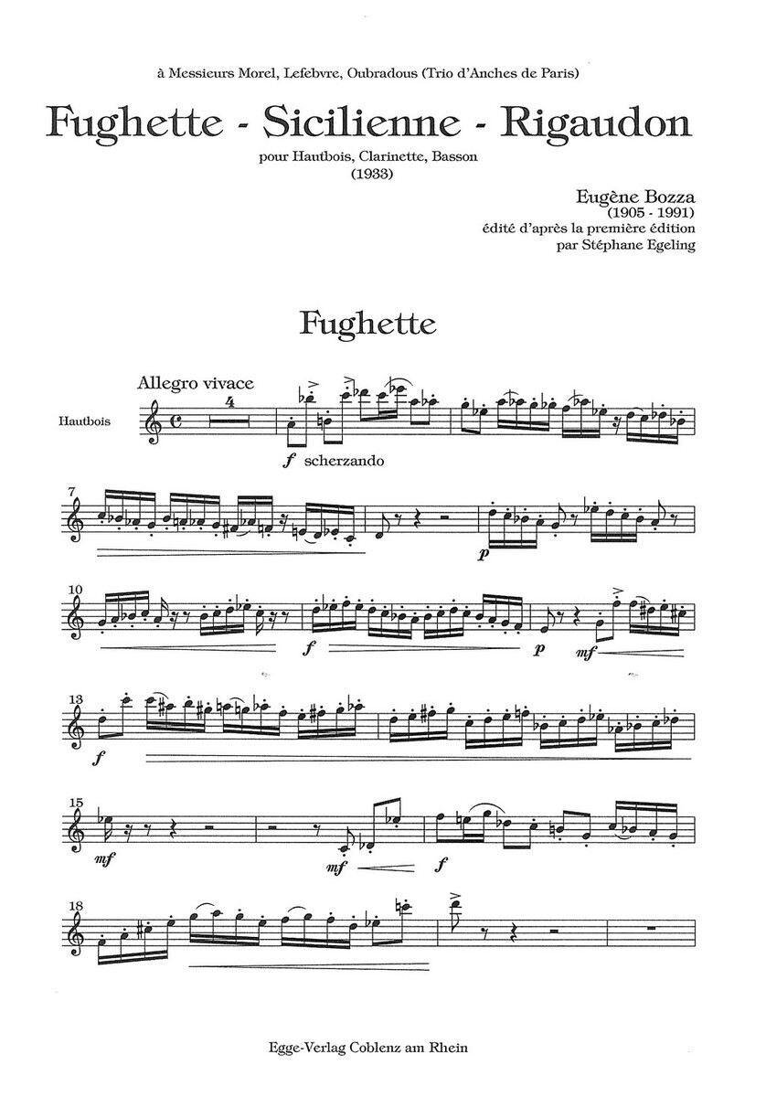 Kolekce tří skladeb Fughette / Sicilienne / Rigaudon, které v roce 1933 napsal skladatel Eugene Bozza pro hoboj, klarinet a fagot. Sešit obsahuje partituru plus samostatně vložené party