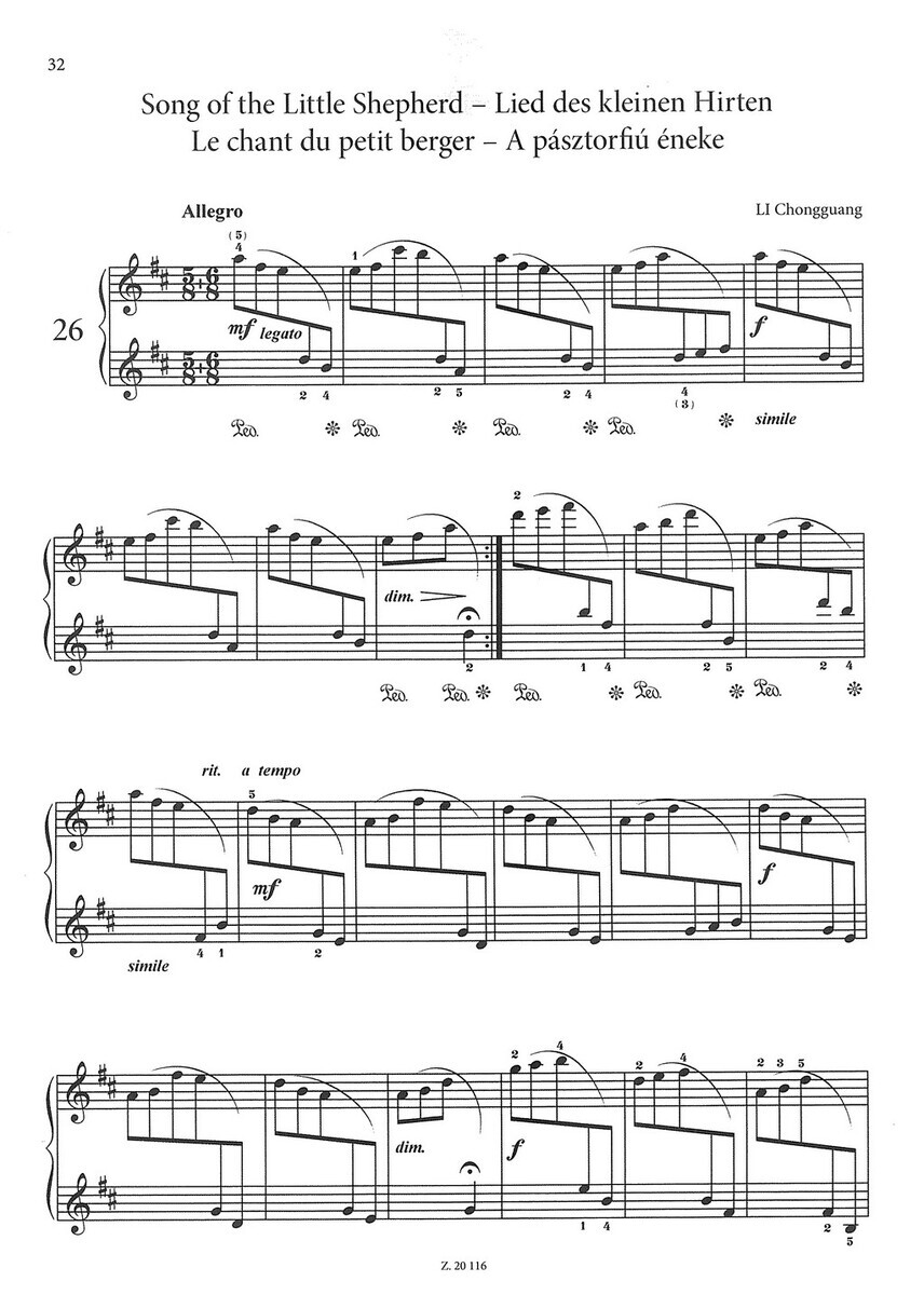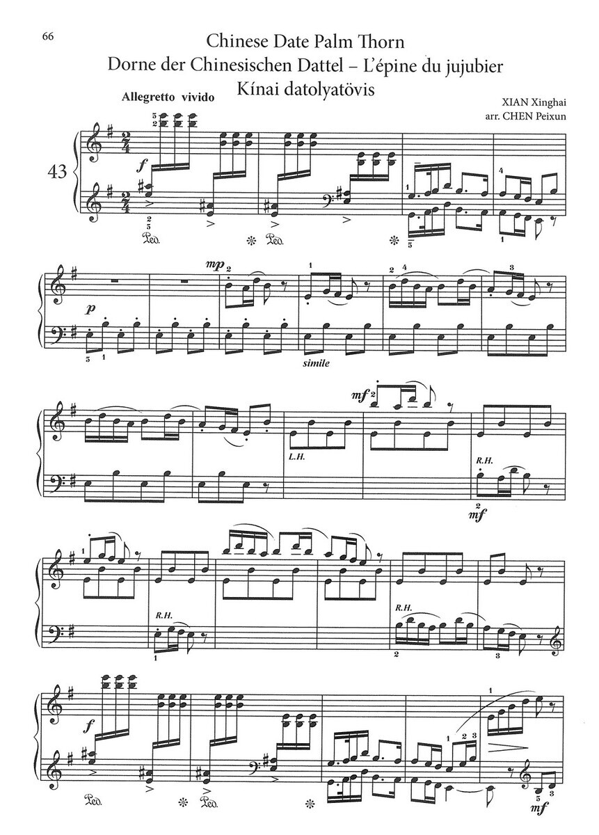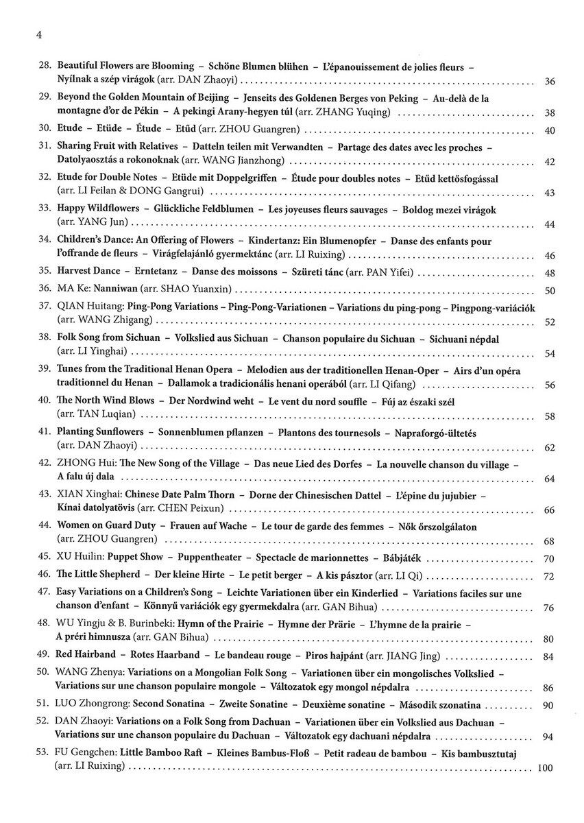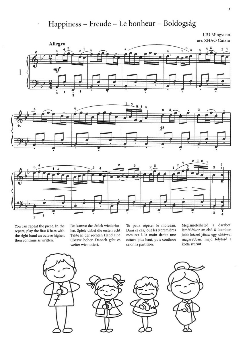 „Chinese Piano Pieces for Children“ je sbírka skladeb, která má začínajícím klavíristům přiblížit jedinečné melodie a harmonický svět čínské hudby. Klavírní skladby vybrané do tohoto sešitu se vyznačují veselými tématy a melodiemi, které mohou znít evropským uším nezvykle, ale jsou snadno přístupné - často pentatonické – a s hravými klavírními technikami, které mladým klavíristům zpříjemňují poznávání východní hudby. Skladby v sešitě jsou seřazeny pro obtížnosti, od úplně jednoduchých až po mírně pokročilé.