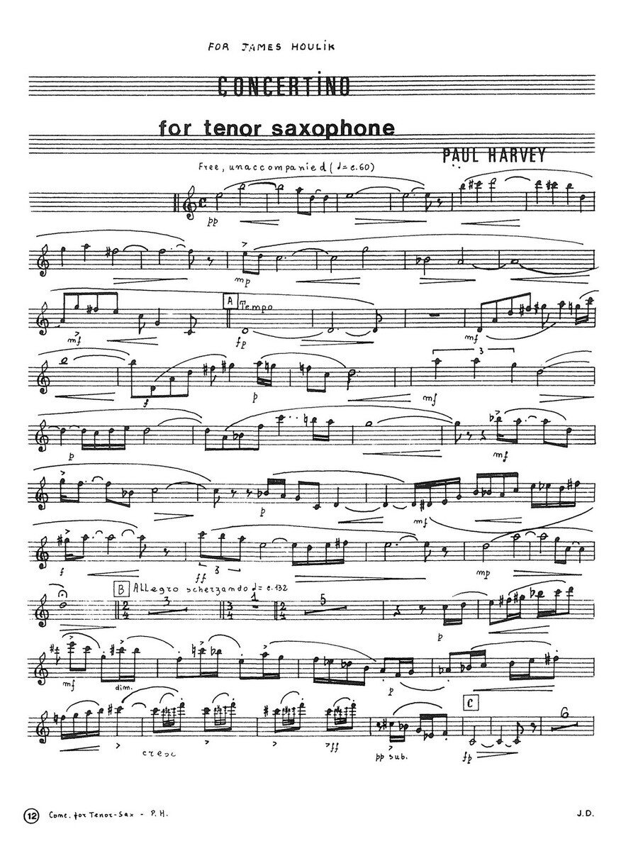 Concertino pro tenorový saxofon a klavír je koncertní skladba britského skladatele, saxofonisty a pedagoga Paula Harveyho, která představuje atraktivní a hudebně poutavý repertoár pro pokročilé hráče na tenorový saxofon. Skladba je vhodná pro koncertní vystoupení, soutěže nebo absolventské recitály, a díky své hudební srozumitelnosti a přístupnosti zároveň zaujme i širší publikum.