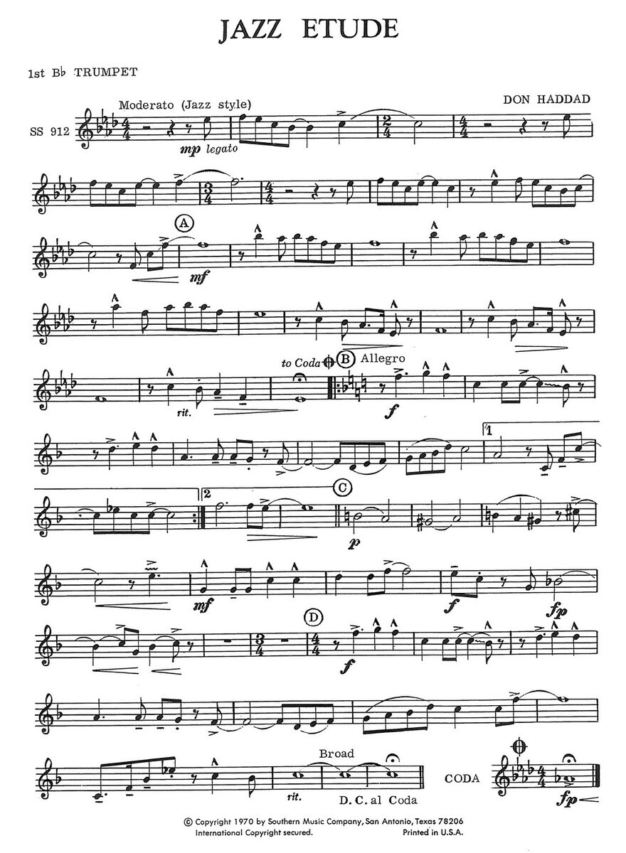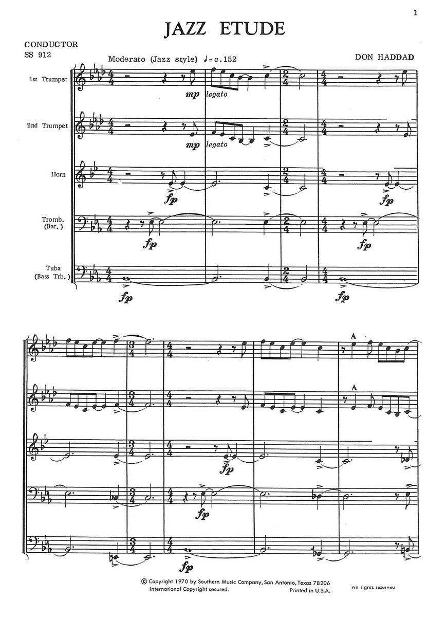 „Jazz Etude“ pro žesťový kvintet od Dona Haddada je svěží a stylově výrazná skladba, která spojuje prvky klasické komorní hry s charakteristickými znaky jazzu. Tato etuda je určena pro středně pokročilé soubory a představuje ideální materiál pro rozvoj rytmické přesnosti, souhry a dynamického cítění. Skladba využívá typické jazzové prvky – synkopu, swingový rytmus a zajímavé harmonické postupy, které dávají hráčům prostor pro výraz i technickou flexibilitu. Etuda je koncipována jako plnohodnotná přednesová skladba a skvěle se hodí jak pro studijní účely, tak pro koncerty a soutěže. Skladba je napsána pro obsazení 2x trumpeta, lesní roh, trombon (baryton) a tuba (basový trombon).