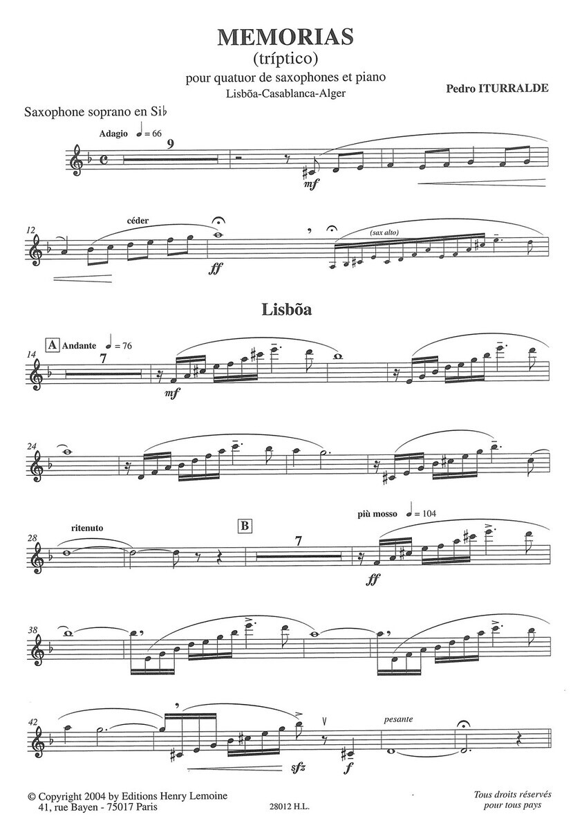 Memorias (Tríptico) je působivá třívětá skladba pro saxofonové kvarteto a klavír od španělského skladatele a saxofonisty Pedra Iturraldeho. Skladba propojuje prvky klasické hudby s nádechem španělské melodiky a provede Vás paletou nálad a vzpomínek. Od melancholické lyričnosti po temperamentní rytmy, každá část tohoto triptychu odhaluje Iturraldeho mistrovské zacházení s melodií a harmonií. Aranžmá pro čtyři saxofony a klavír klade důraz na vyváženou souhru všech čtyř saxofonových hlasů (soprán, alt, tenor, baryton) a klavíru, který není pouhým doprovodem, ale stává se rovnocenným partnerem souboru. Skladba byla napsána v roce 2004 a je vhodná pro středně a více pokročilé hráče, kteří chtějí rozvíjet nejen techniku hry, ale i smysl pro styl, frázování a dynamiku v rámci souborové hry.