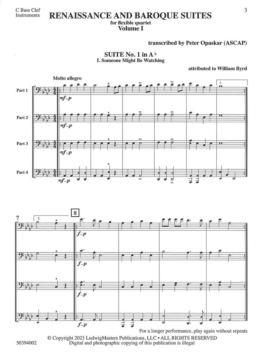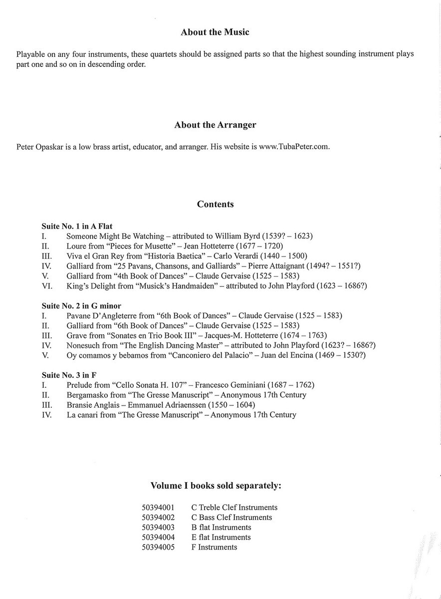 „Renaissance and Baroque Suites, vol. 1“ je sbírka tří suit, které byly sestaveny z děl renesančních a barokních skladatelů. Skladby jsou aranžovány ve snadné úpravě pro malý komorní soubor – kvartet, pro flexibilní složení hudebního souboru.