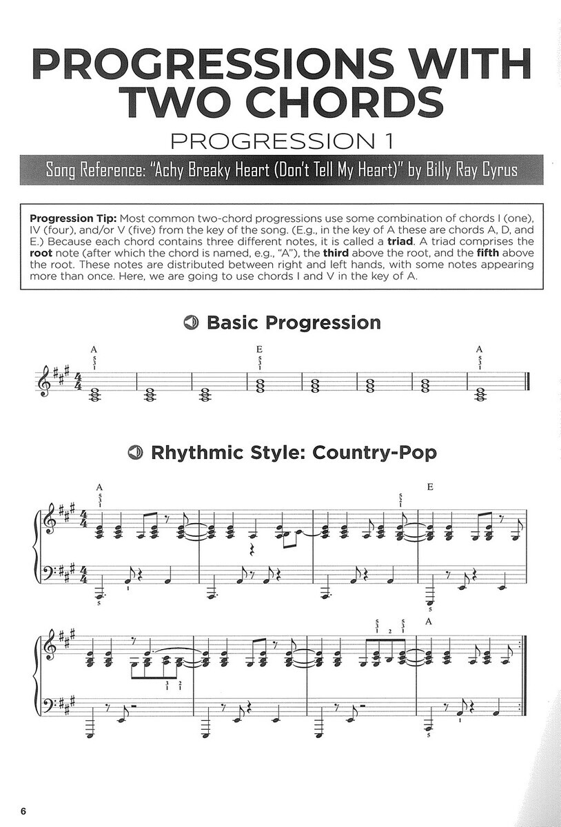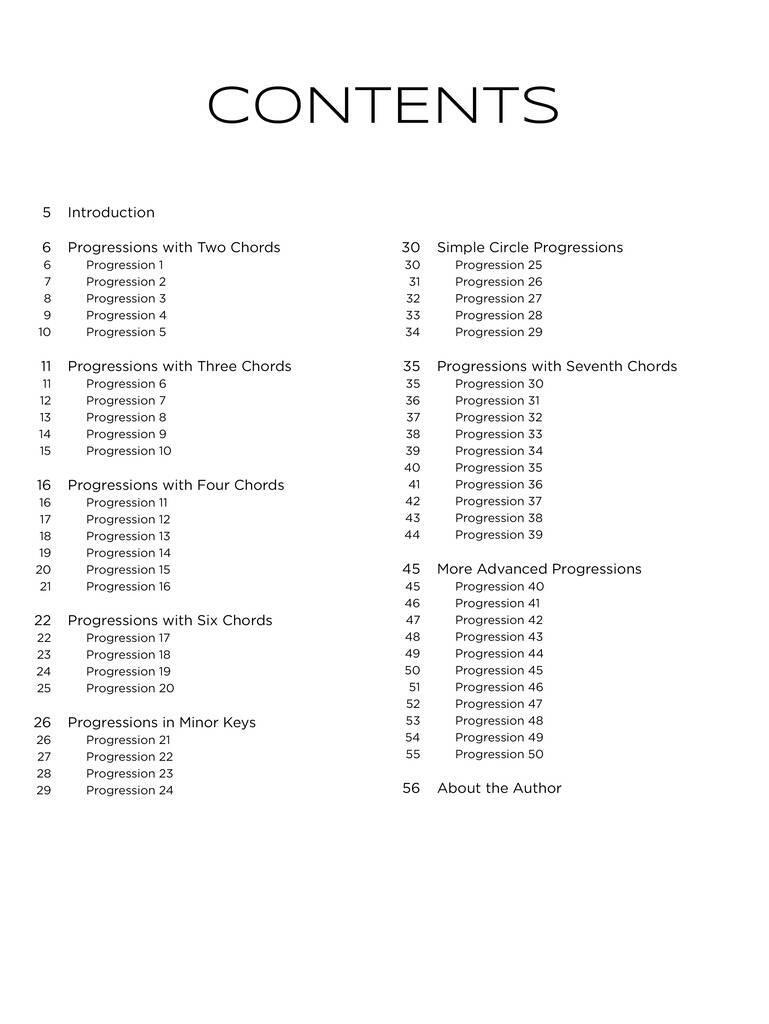 „First 50 Chord Progressions ….“ je jedinečná sbírka základních akordových postupů na klavír používaných v populární hudbě – od popu a rocku přes hip-hop a R&B až po jazz a gospel.  Každý postup je v sešitě přehledně zapsán a doplněn o možnost poslechu demo nahrávky.  Díky tomu si klavíristé mohou snadno osvojit nejen samotné akordy, ale i jejich praktické využití v hudbě. Publikace je vhodná pro klavíristy, kteří chtějí rozšířit své znalosti harmonie a naučit se hrát postupy, které tvoří základ moderní populární hudby. Sbírka je vhodná pro samostudium i pro použití při výuce a představuje skvělý most mezi teorií a praxí.