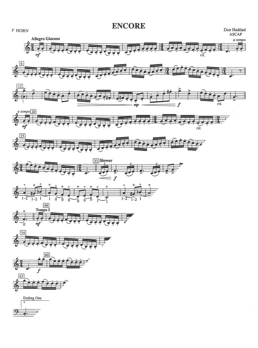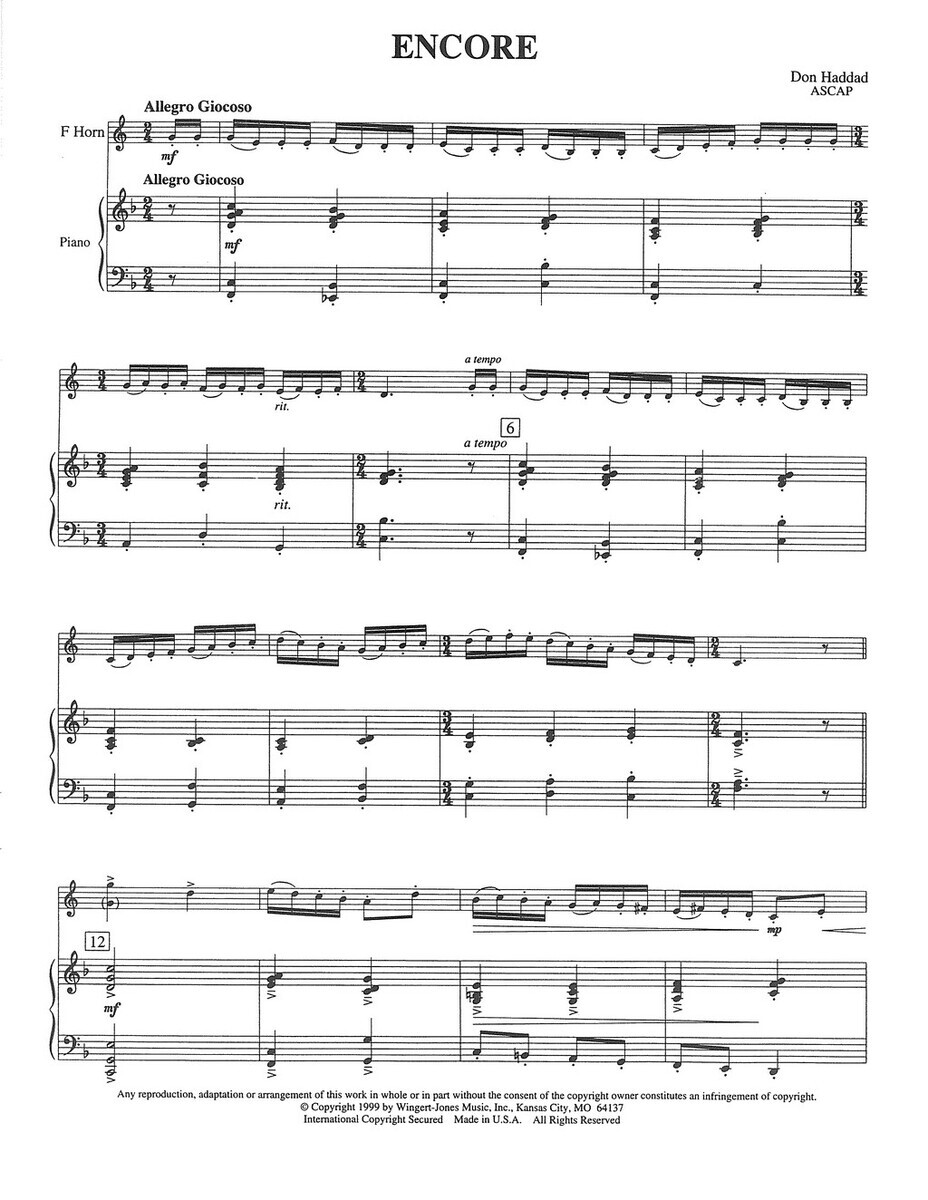 „Encore“ je krátká a efektní skladba, kterou skladatel Don Haddad napsal pro středně a více pokročilé hráče na lesní roh s doprovodem klavíru.