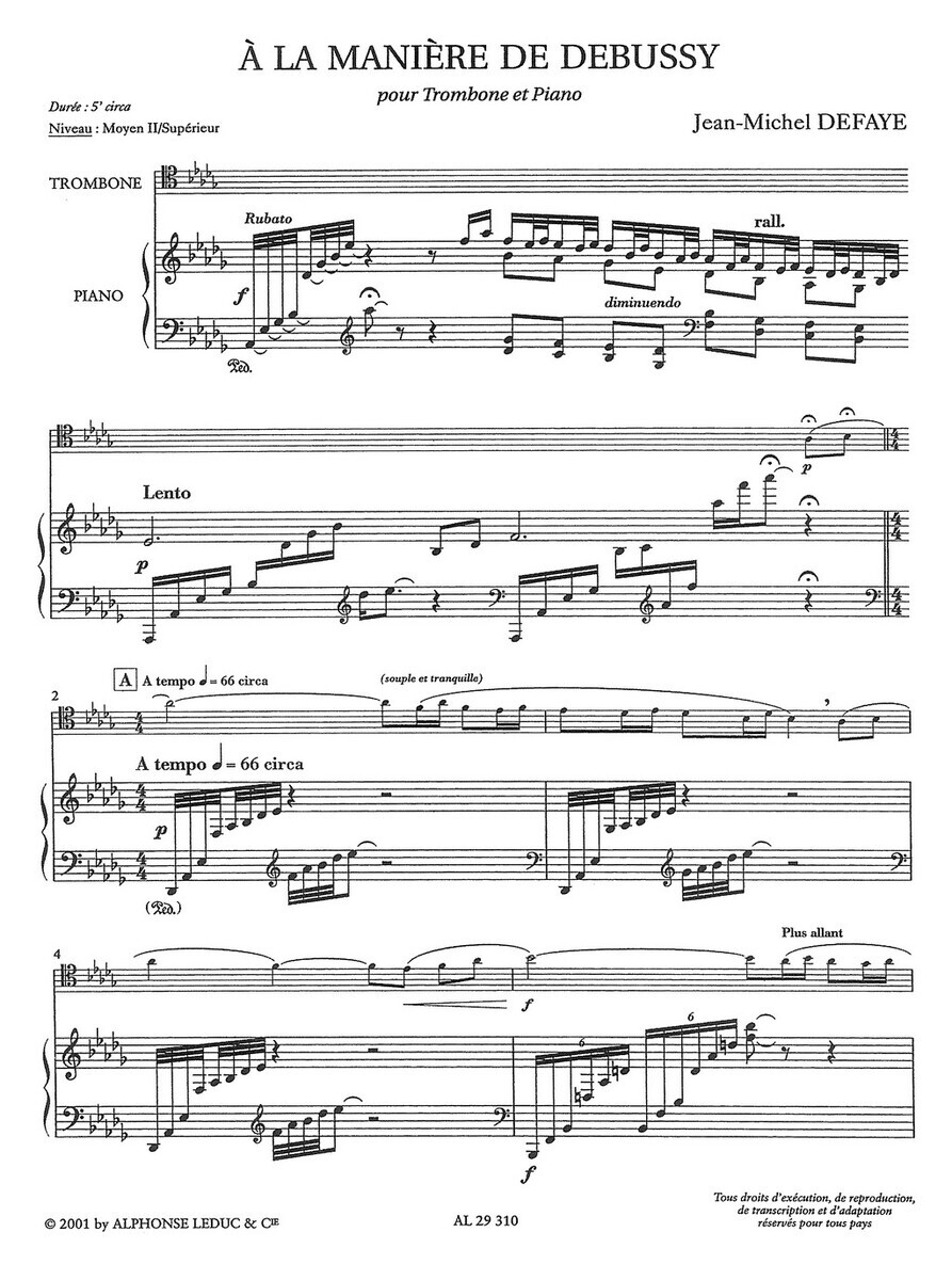 „À la Manière de Debussy“ (Ve stylu Debussyho) francouzského skladatele Jeana-Michela Defaye je působivá kompozice pro trombón a klavír, která vzdává hold impresionistickému mistrovi Claudu Debussymu. Skladba vznikla jako součást cyklu, v němž Defaye s respektem napodobuje styl významných skladatelů. V tomto případě čerpá z Debussyho typické barevnosti, bohaté harmonie a jemné zvukomalby. Díky lyrickým melodiím trombónu a sofistikovanému klavírnímu doprovodu vzniká atmosféra snová a introspektivní, zároveň však technicky náročná a interpretačně inspirativní. Skladba přináší nejen výzvu v podobě bohaté dynamiky a výrazové šíře, ale i radost z objevování Debussyho poetiky v novém, originálním kontextu.