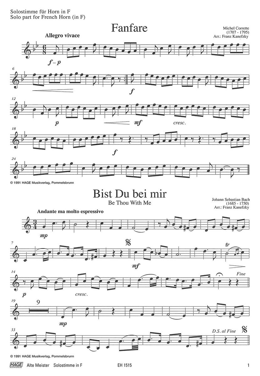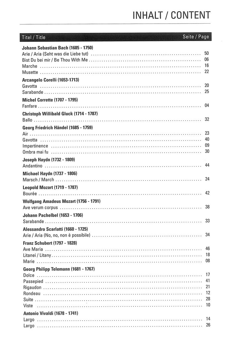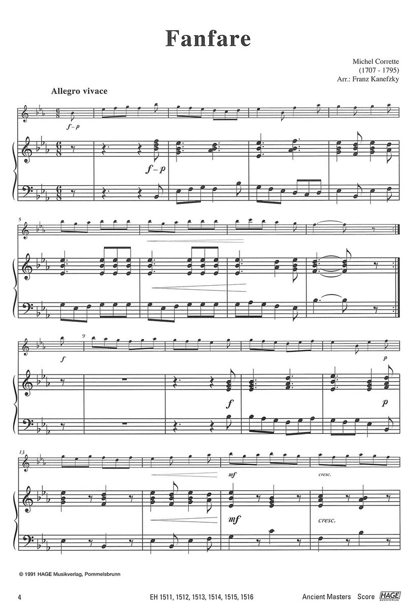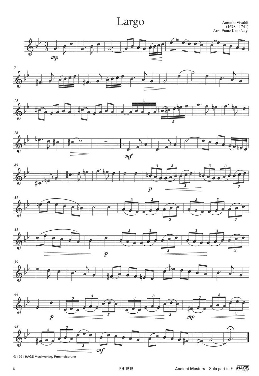 „Ancient Masters“ Vám přínáší 29 pečlivě vybraných děl klasického repertoáru v úpravě pro lesní roh (f horn) s klavírním nebo varhanním doprovodem. V sešitě najdete výběr oblíbených skladeb od Bacha, Händela, Telemanna, Corelliho, Vivaldiho, Haydna, Mozarta nebo Schuberta, od duchovních árií typu „Ave verum corpus“ či „Ave Maria“ přes lyrické andantina až po slavnostní fanfáry a barokní taneční formy. Ať už se jedná o koncert, recitál nebo slavnostní a jiné události, ve sbírce naleznete vhodné skladby pro každou příležitost. Skladby jsou vhodné také pro vystoupení v kostelech s varhanním doprovodem.