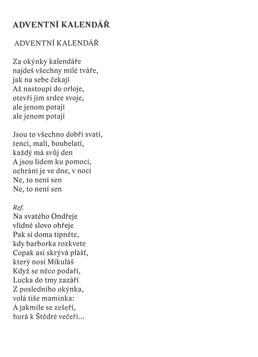 Unikátní zpěvník předvánočních písní, který vychází z lidových tradic adventního zpívání. Písničky jsou vhodné na program k rozsvěcování vánočních stromků, pro vánoční besídky a koncerty základních a hudebních škol, a také samozřejmě pro domácí muzicírování. Písníčky jsou napsány v úpravě melodická linka s textem, akordové značky a klavírní doprovod a za každou písničkou je také samostatná stránka s textem písničky.