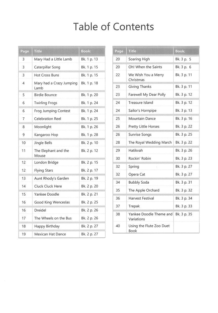 „Flute Zoo Duet Book“ je sbírka snadných duet pro dvě příčné flétny, kterou autorka Kathy Blocki doplnila svou školu hry na příčnou flétnu „Flute Zoo Books 1-3“. První hlas duet vychází z melodií jednotlivých sešitů této školy (u názvu skladby je vždy uvedeno ze kterého sešitu a na které stránce je tato melodie), a pro žáky, kteří těmito díly prochází budou tyto melodie již známé. Druhý hlas je napsán pro učitele nebo zkušenějšího spolužáky a slouží jako opora pro rytmickou jistotu, intonaci i stylovou souhru; díky tomu se dueta hodí jak pro individuální lekce, tak pro společné hraní rodič–dítě i pro malé skupiny ve výuce. Obtížnost skladeb je vhodná především pro začátečníky až mírně pokročilé flétnisty.