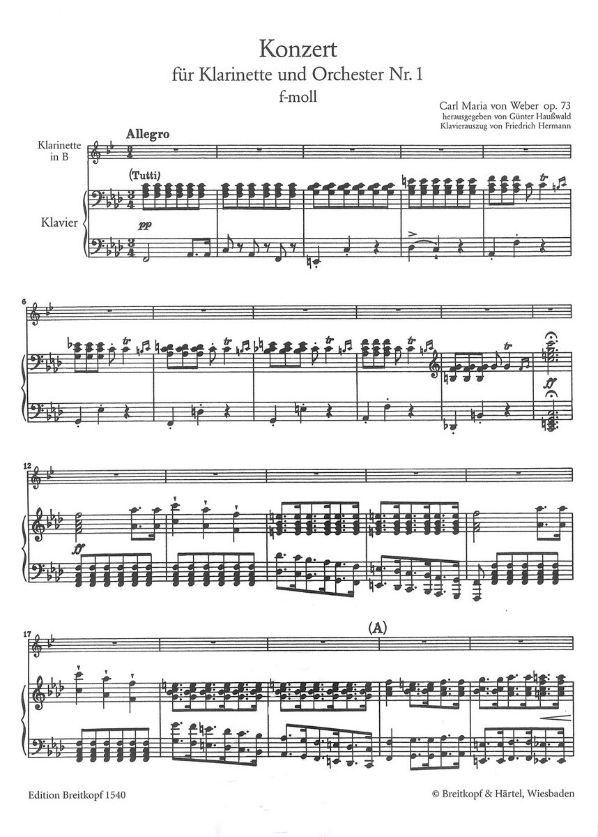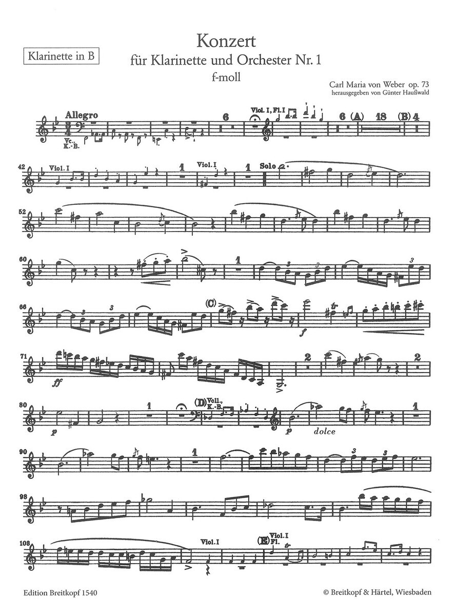 „Clarinet Concerto No.1 in F minor op.73“ (Klarinetový koncert č. 1 f- moll, Op. 73) je skladba, kterou skladatel Carl Marii von Weber napsal v roce 1811 pro klarinetistu Heinricha Josepha Baermanna. Jedná se o koncertní dílo, které se rychle stalo jedním z pilířů klarinetového repertoáru a dodnes patří k nejhranějším koncertům pro tento nástroj. Weber v něm mistrně využívá všechny možnosti klarinetu – od zpěvných melodických linií až po brilantní technické pasáže. Noty jsou určeny především pro klarinetisty na středné a více pokročilé úrovni, kteří chtějí poznat jedno z nejvýznamnějších děl romantického repertoáru. Dílo je vhodné jak pro sólové vystoupení s klavírem, tak jako příprava na orchestrální provedení.