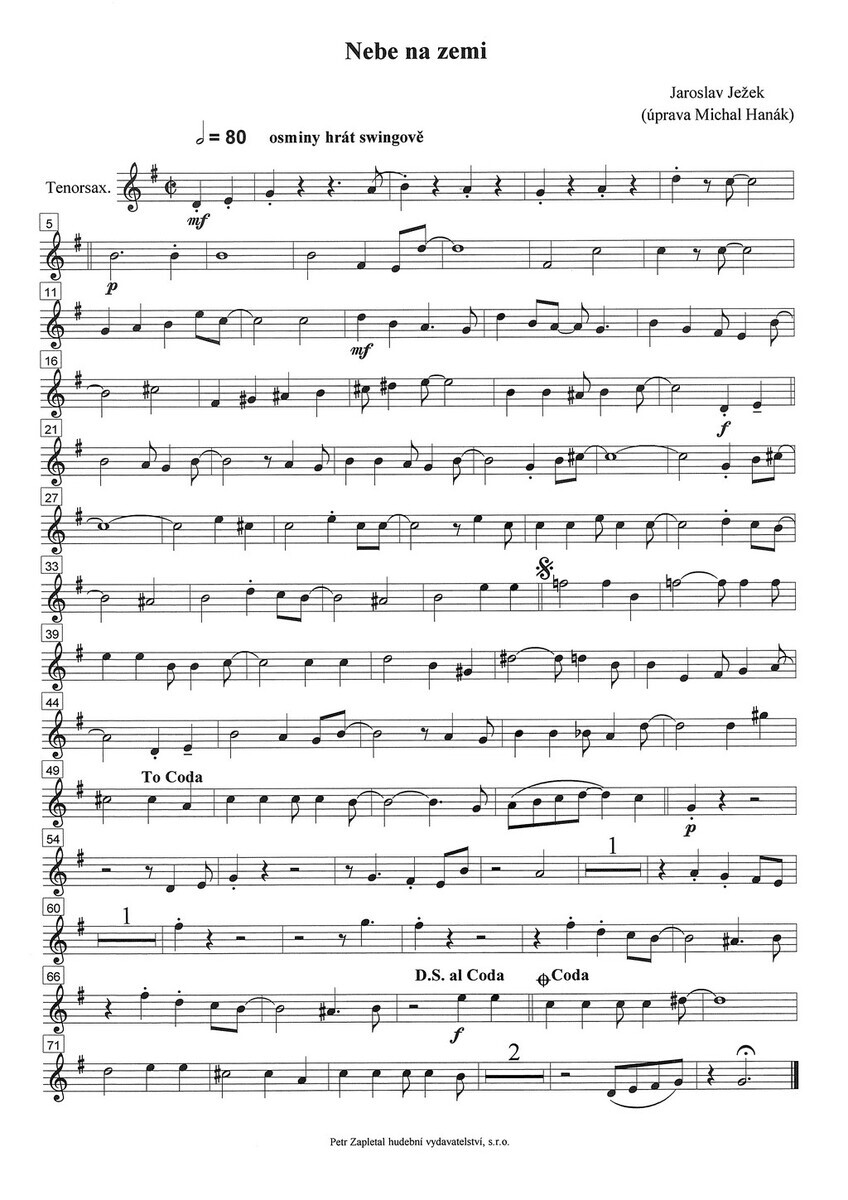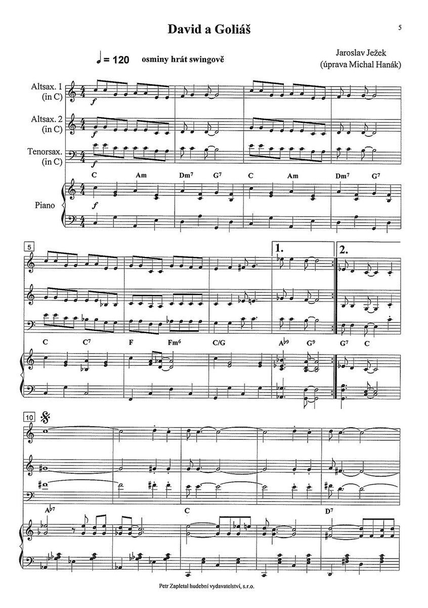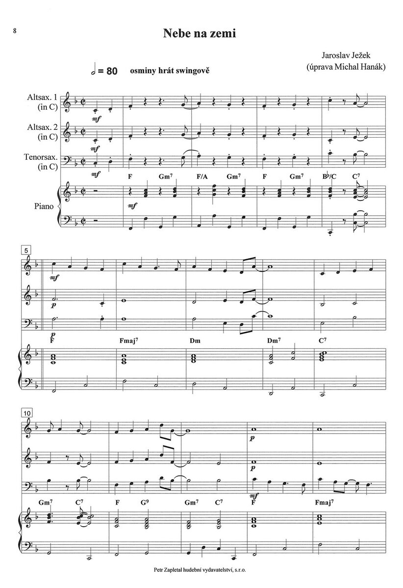 "Tři písně pro tři saxofony (AAT) a klavír" Vám přináší aranžmá tří oblíbených písní Jaroslava Ježka („Život je jen náhoda“, „David a Goliáš“, „Nebe na zemi“) v úpravě Michala Hanáka pro saxofonové trio (AAT) s klavírním doprovodem.  Sešit obsahuje partituru plus samostatně vložené party pro jednotlivé nástroje.