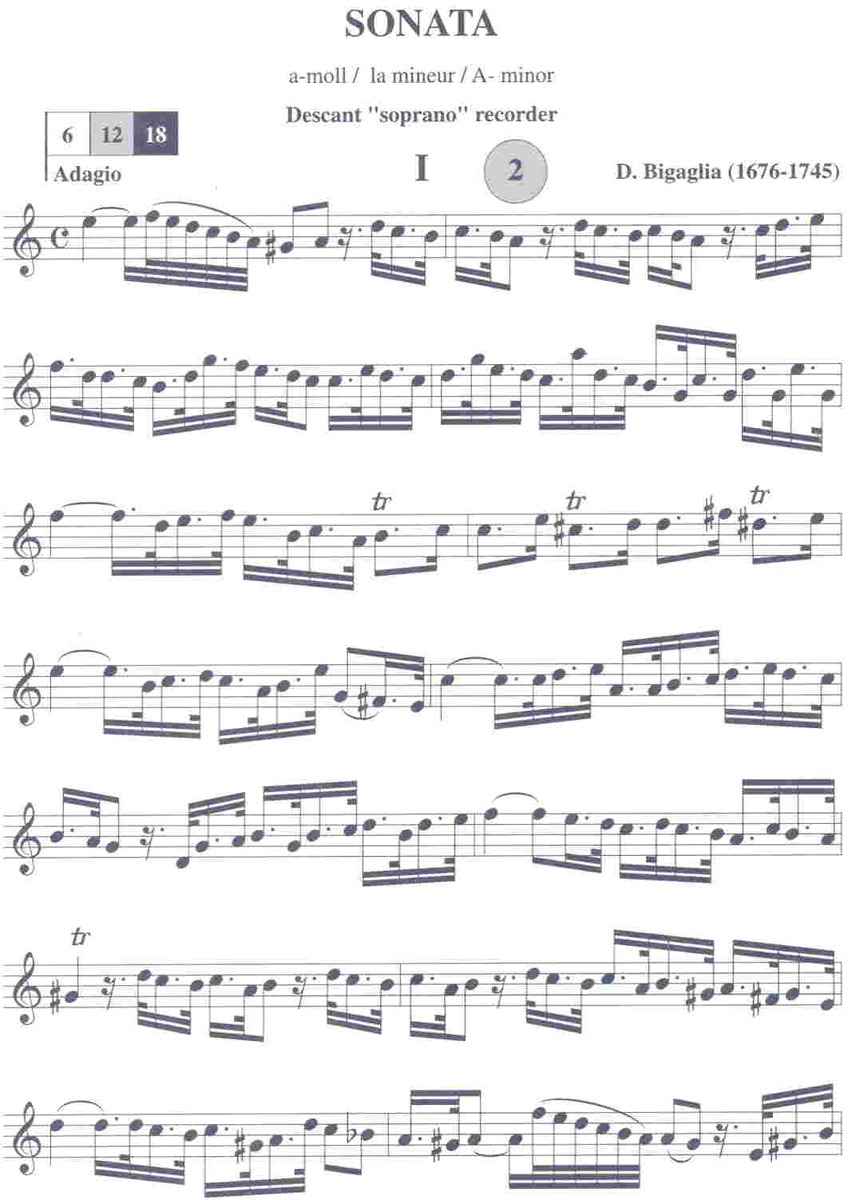Nádherná Sonáta v A-moll pro zobcovou flétnu a cembalo (harpsichord) od DIOGENIO BIGAGLIA . Titul obsahuje part pro zobocovu flétnu a CD, na kterém jsou všechny čtyři věty této sonáty nahrány v plném znění a po té pouze doprovod pro Vaši hru. Doprovod je zde nahrán 3x, v pomalém tempu, středním tempu a originálním tempu. Velmi krásná skladba pro pokročilejší hráče na zobcovou flétnu !!!