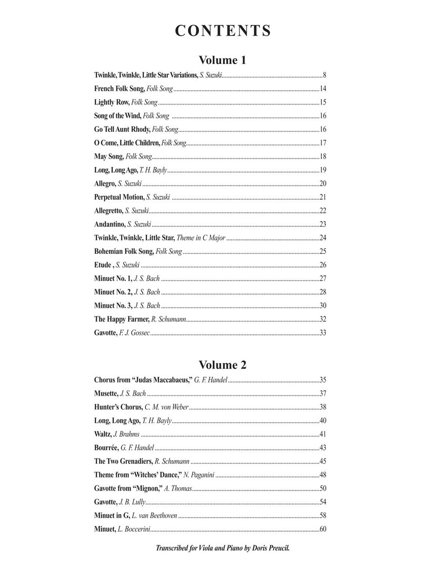 Twinkle, Twinkle, Little Star Variations (Shinichi Suzuki)French Folk SongLightly RowSong of the WindGo Tell Aunt RhodyO Come , Little ChildrenMay SongLong, Long Ago (T.H.Bayly)Allegro (Shinichi Suzuki)Perpetual Motion (Shinichi Suzuki)Allegretto (Shinichi Suzuki)Andantino (Shinichi Suzuki)Bohemian Folk SongEtude (Shinichi Suzuki)Minuet No. 1 (J.S.Bach) Minuet No. 2 (Johann Sebastian Bach)Minuet No. 3 (Johann Sebastian Bach)The Happy Farmer (R.Schumann)Gavotte (F.J.Gossec)Chorus From "Judas Maccabaeus" (Georg Frideric Handel)Musette (Johann Sebastian Bach)Hunters' Chorus from opera "Der Frerischutz" (Carl Maria Von Weber)Long, Long Ago (T.H.Bayly)Waltz (J.Brahms)Bourrée (G.F.Handel)The Two Grenadiers (Robert Schumann)Theme From Witch's Dance (Niccolo Paganini)Gavotte (A.Thomas)Gavotte (J.B.Lully)Minuet in F (L.van Beethove)Minuet in E major (L.Boccherini)