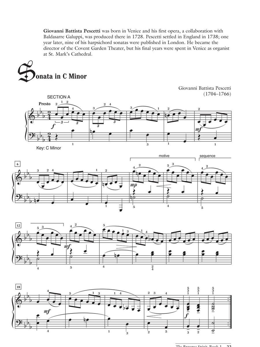 Aria (Scarlatti)Folia (Scarlatti)Sonata in A Major (Galuppi)Sonata in C Minor (Pescetti)Gavotte (Corelli)Fughetta in E Minor (Zipoli)Sonata in G Major (Scarlatti)Tambourin (Rameau)Menuet (Lully)Le Petite-Rien (Couperin)Rigaudon I, II and Variation (Rameau)Little Prelude in C Major, BWV 939 (Bach)Fantasia (Telemann)Invention (Kirnberger)Invention No.8 in F Major, BWV 779 (Bach)Musette, BWV Anh.126 (Bach)Musette (Gräfe)Hornpipe in F Minor (Purcell)Sarabande (Pachelbel)Chanconne (Fischer)Prelude in G Major (Handel)
