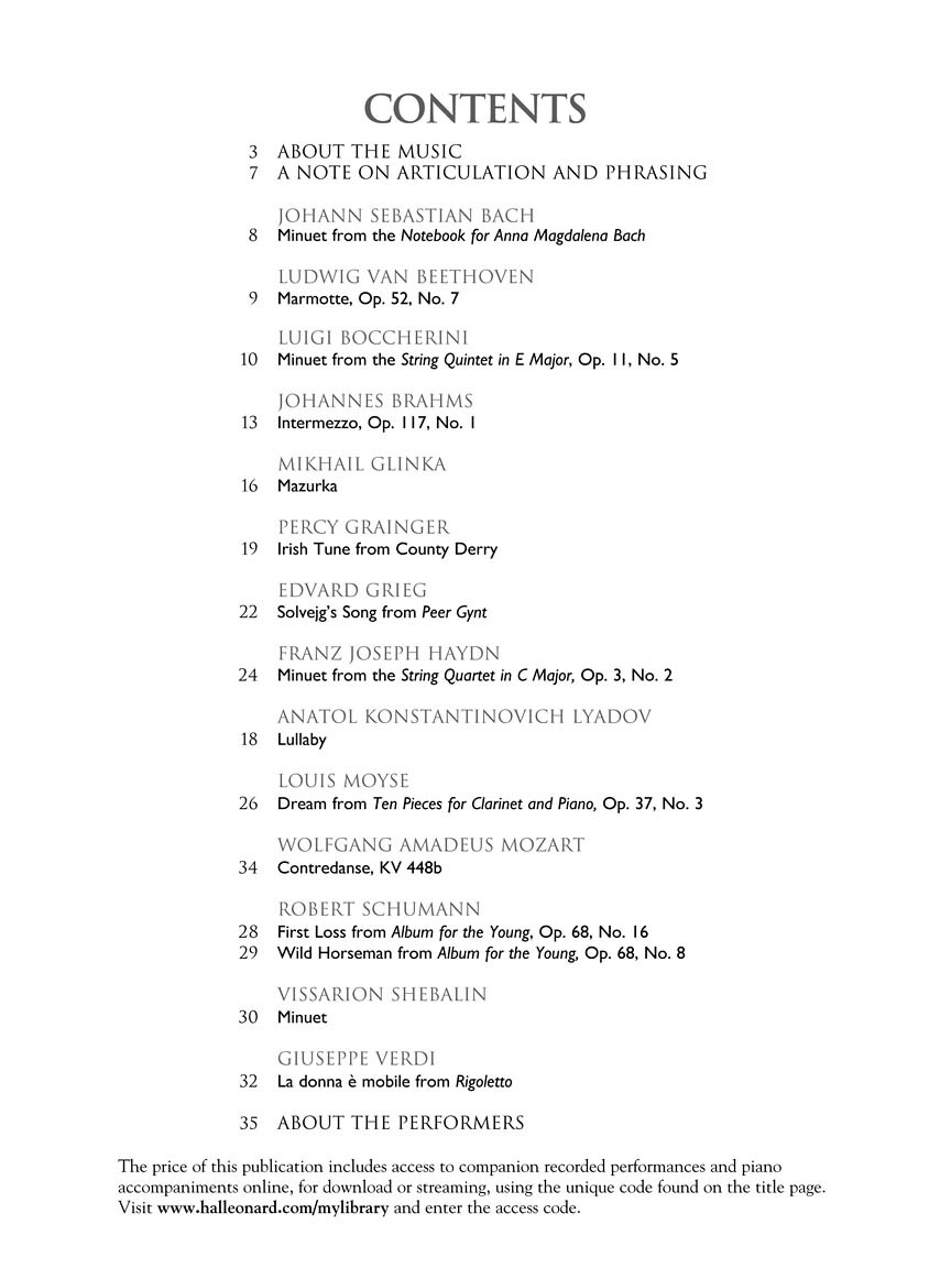 Minuet from the NOTEBOOK FOR ANNA MAGDALENA BACH (J.S. Bach)Marmotte, Op. 52, No. 7 (Beethoven)Minuet from the STRING QUINTET IN E MAJOR, Op. 11, No. 5 (Boccherini)Intermezzo, Op. 117, No. 1 (Brahms)Mazurka (Glinka)Irish Tune from County Derry (Grainger)Solvejg's Song from PEER GYNT (Grieg)Minuet from the STRING QUARTET IN C MAJOR, Op. 3, No. 2 (Haydn)Lullaby (Lyadov)Dream from TEN PIECES FOR CLARINET AND PIANO, Op. 37, No. 3 (Moyse)Contredanse, KV 448b (Mozart)First Loss from ALBUM FOR THE YOUNG, Op. 68, No. 16 (Schumann)Wild Horseman from ALBUM FOR THE YOUNG, Op. 68, No. 8 (Schumann)Minuet (Shebalin)La donnae mobile from RIGOLETTO (Verdi)