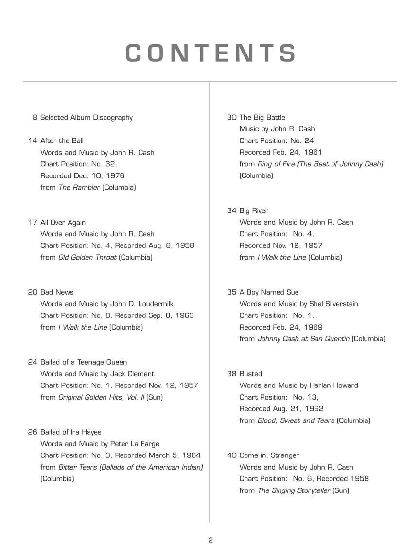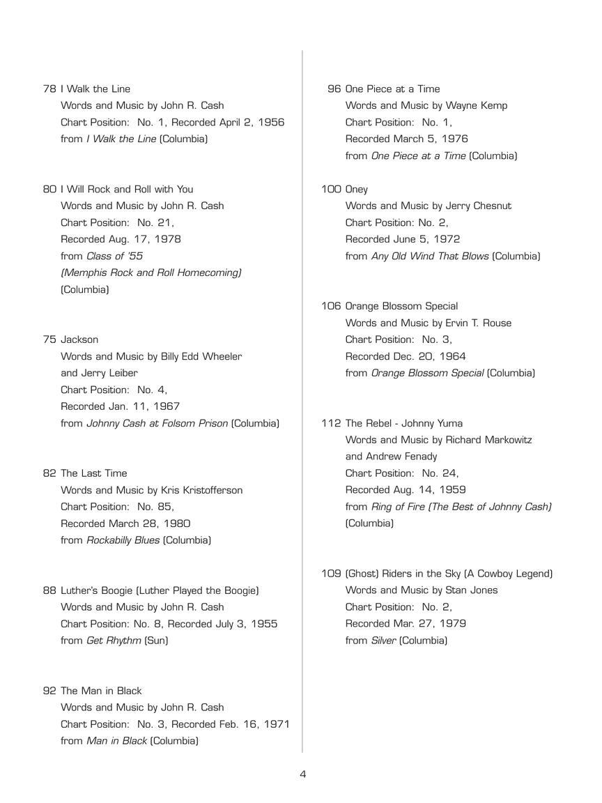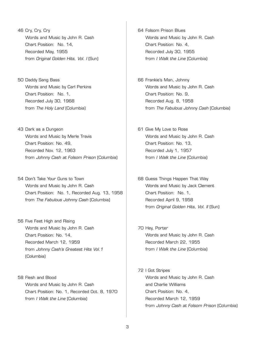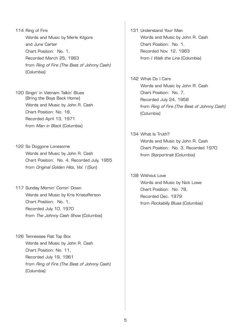 A Boy Named SueAfter The BallAll Over AgainBad NewsBallad Of A Teenage QueenBallad Of Ira HayesBig RiverBustedCome In, StrangerCry, Cry, CryDaddy Sang BassDark As A DungeonDon't Take Your Guns To TownFive Feet High And RisingFlesh And BloodFolsom Prison BluesFrankie's Man, JohnnyGive My Love To RoseGuess Things Happen That WayHey, PorterI Got StripesI Walk The LineI Will Rock And Roll With YouJacksonLuther's Boogie (Luther Played The Boogie)One Piece At A TimeOneyOrange Blossom SpecialRing Of FireSingin' In Vietnam Talkin' Blues (Bring The Boys Back Home)So Doggone LonesomeSunday Mornin' Comin' DownTennessee Flat Top BoxThe Big BattleThe Last TimeThe Man In BlackThe Rebel (The Ballad of Johnny Yuma)Understand Your ManWhat Do I CareWhat Is Truth?Without Love