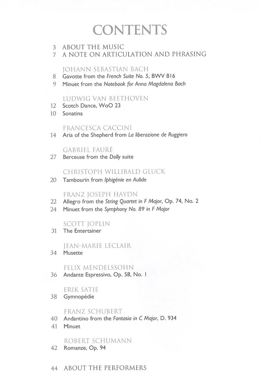 Gavotte from the FRENCH SUITE NO. 5, BWV 816 (J.S. Bach)Minuet from the NOTEBOOK FOR ANNA MAGDALENA BACH (J.S. Bach)Scotch Dance, WoO 23 (Beethoven)Sonatina (Beethoven)Aria of the Shepherd from LA LIBERAZIONE DE RUGGIERO (F. Caccini)Berceuse from the DOLLY suite (Fauré)Tambourin from IPHIGÉNIE EN AULIDE (Gluck)Allegro from the STRING QUARTET IN F MAJOR, Op. 74, No. 2 (Haydn)Minuet from the SYMPHONY NO. 89 IN F MAJOR (Haydn)The Entertainer (Joplin)Musette (Leclair)Andante Espressivo, Op. 58, No. 1 (Mendelssohn)Gymnopédie (Satie)Andantino from the FANTASIA IN C MAJOR, D. 934 (Schubert) Minuet (Schubert) Romanze, Op. 94 (Schumann)