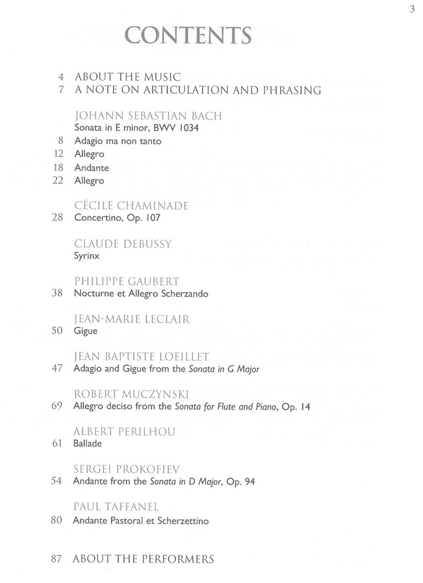 Sonata in E minor, BWV 1034-Adagio ma non tanto (J.S. Bach)Sonata in E minor, BWV 1034-Allegro (J.S. Bach)Sonata in E minor, BWV 1034-Andante (J.S. Bach)Sonata in E minor, BWV 1034-Allegro (J.S. Bach)Concertino, Op. 107 (Chaminade)Syrinx (Debussy)Nocturne et Allegro Scherzando (Gaubert)Gigue (Leclair)Adagio and Gigue from the SONATA IN G MAJOR (Loeillet)Allegro deciso from the SONATA FOR FLUTE AND PIANO, Op. 14 (Muczynski)Ballade (Perilhou)Andante from the SONATA IN D MAJOR, Op. 94 (Prokofiev)Andante Pastoral et Scherzettino (Taffanel)