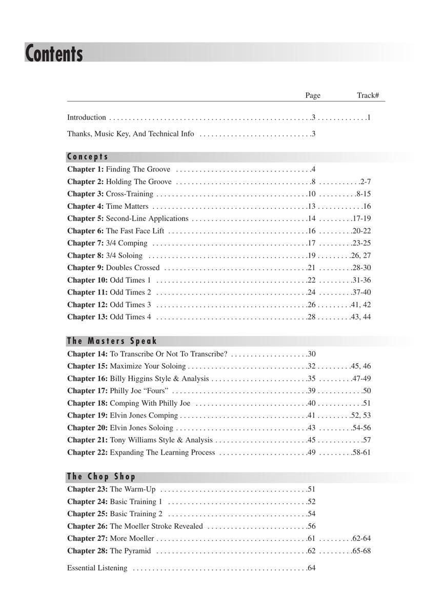 Známý americký bubeník a učitel John Riley Vás tímto titulem zve do jeho jazzové bubenické dílny, kde Vám vysvětlí, ukáže a předvede bubenické témata (doprovod, sóla, grooves a další), rozebere s Vámi hru některých výborných bubeníků (Elvin Jones, Tony Williams a dalších) a nabídne zdokonalení Vaší bubenické techniky pomocí některých rozehrávacích cvičení, Moeller techniky a dalších. Všechny v sešitě získané informace Vám dohromady poskytnou inspirativní cestu k Vašemu dalšímu bubenickému růstu a rozvoji. Na přiloženém CD je nahrána většina v sešitě uvedených ukázek, cvičení a příkladů, pro Vaši představu, jak má znít jejich správné provedení !!!