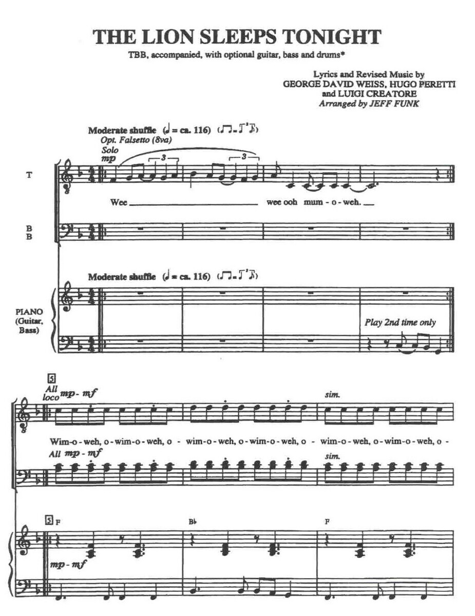 Krásná píseň, která byla napsána pod názvem "Mbube" (lev) v roce 1939, v roce 1961 píseň již pod současným názvem THE LION SLEEPS TONIGHT proslavila vokální skupina The Tokens . Současní posluchači budou skladbu nejčastěji znát z nádherného animovaného filmu "The Lion King" (Lví král) z roku 1994 nebo stejnojmenného broadway muzikálu z roku 1997. Skladbu Vám nabízíme v povedeném aranžmá pro mužský TTB vokální soubor s klavírním doprovodem včetně akordových značek a volitelným doprovod pro kytaru, basu a bicí.