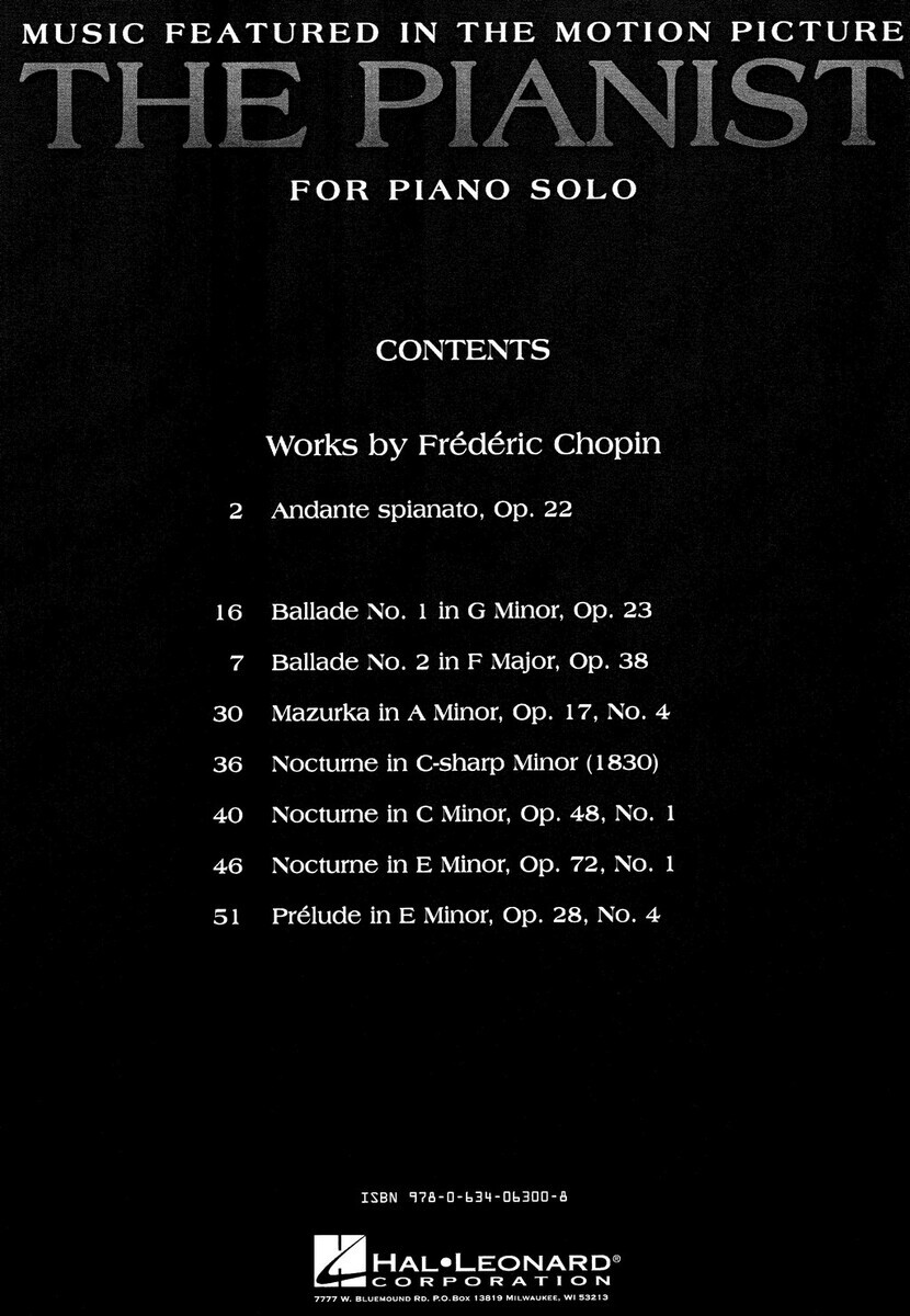 Krásný sešit s nádhernými skladbami F.Chopina, které zazněly ve filmu "The Pianist ". Možná, že již nějaký sešit se skladbami od Chopina máte, ale určitě není tak krásný a určitě ne všechny skladby zazněly ve filmu.