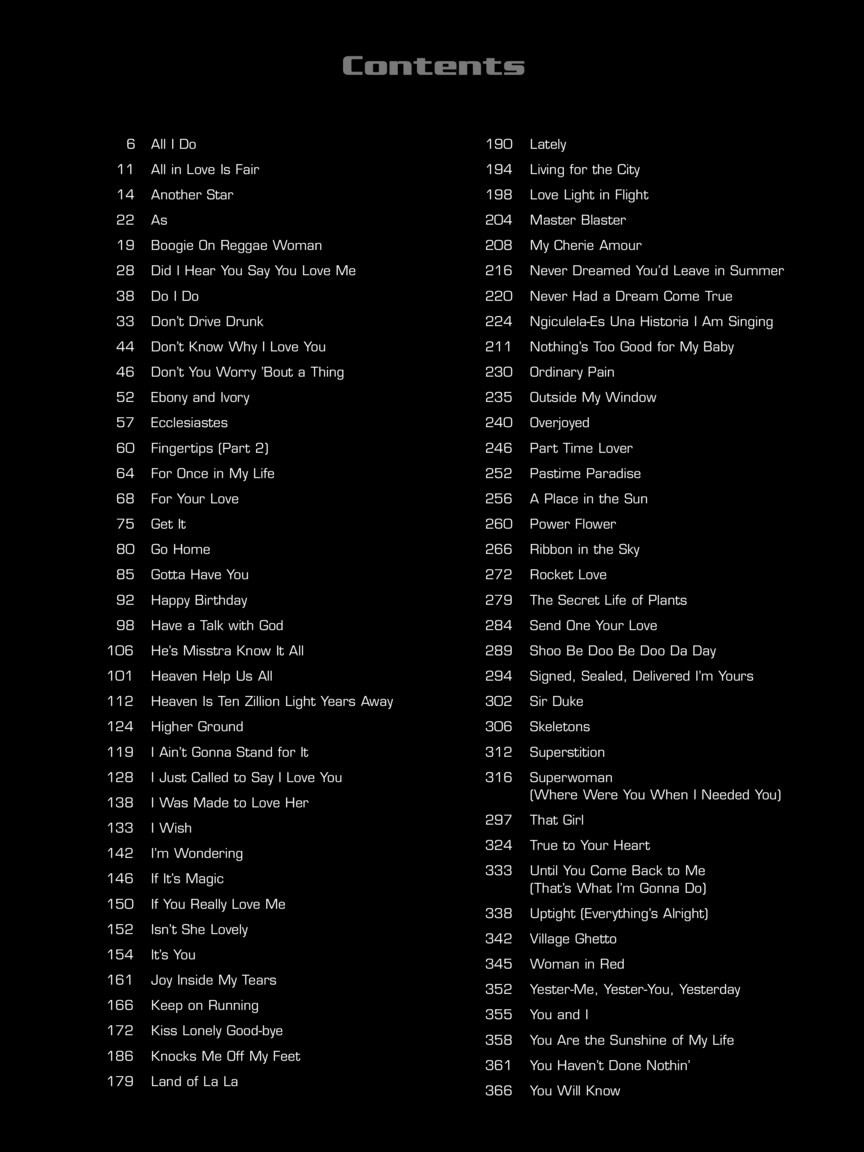 All I DoAll In Love Is FairAnother StarAsBoogie On Reggae WomanDid I Hear You Say You Love MeDo I DoDon't Drive DrunkDon't Know Why I Love YouDon't You Worry 'Bout A ThingEbony And IvoryEcclesiastesFingertips (Part 2)For Once In My LifeFor Your LoveGet ItGo HomeGotta Have YouHappy BirthdayHave A Talk With GodHe's Misstra Know It AllHeaven Help Us AllHeaven Is Ten Zillion Light Years AwayHigher GroundI Ain't Gonna Stand For ItI Just Called To Say I Love YouI Was Made To Love HerI WishI'm WonderingIf It's MagicIf You Really Love MeIsn't She LovelyIt's YouJoy Inside My TearsKeep On RunningKiss Lonely Good-byeKnocks Me Off My FeetLand Of La LaLatelyLiving For The CityLove Light In FlightMaster BlasterMy Cherie AmourNever Dreamed You'd Leave In SummerNever Had A Dream Come TrueNgiculela-Es Una Historia I Am SingingNothing's Too Good For My BabyOrdinary PainOutside My WindowOverjoyedPart Time LoverPastime ParadiseA Place In The SunPower FlowerRibbon In The SkyRocket LoveThe Secret Life Of PlantsSend One Your LoveShoo Be Doo Be Doo Da DaySigned, Sealed, Delivered I'm YoursSir DukeSkeletonsSuperstitionSuperwoman (Where Were You When I Needed You)That GirlTrue To Your HeartUntil You Come Back To Me (That's What I'm Gonna Do)Uptight (Everything's Alright)Village GhettoWoman In RedYester-Me, Yester-You, YesterdayYou And IYou Are The Sunshine Of My LifeYou Haven't Done Nothin'You Will Know