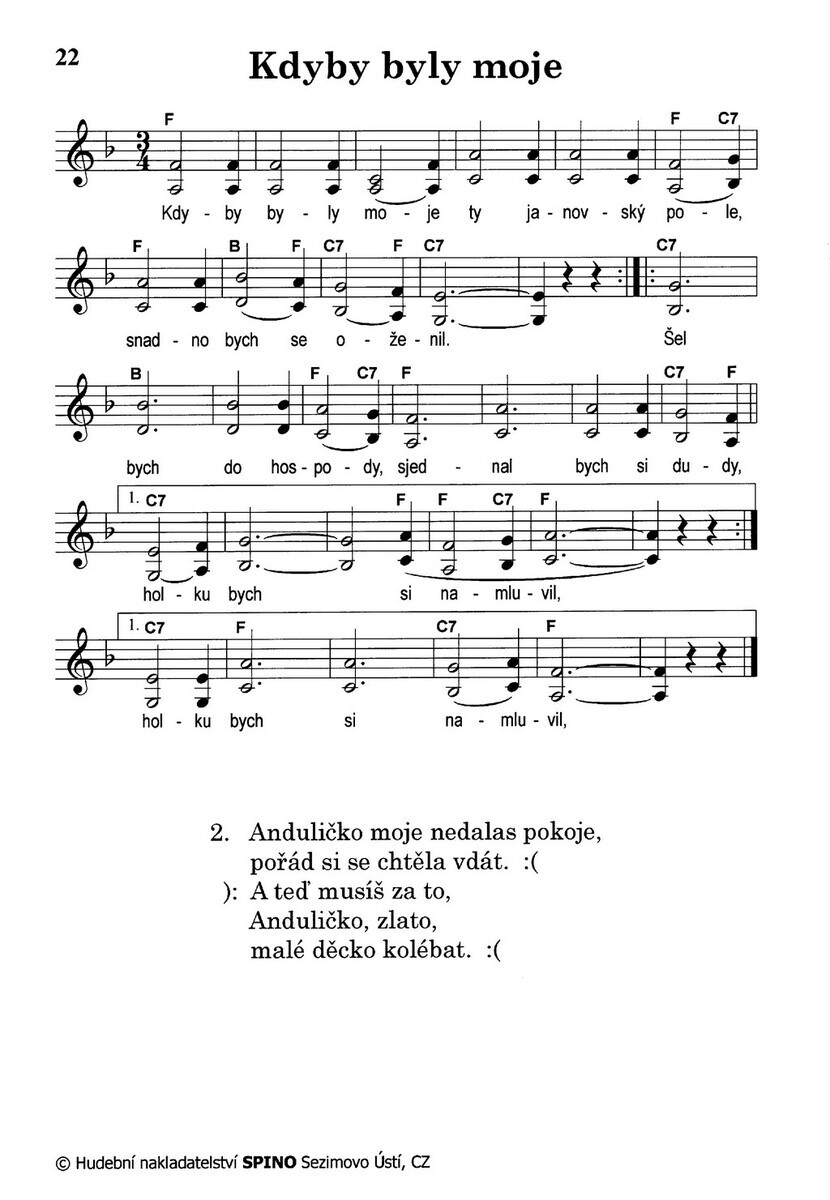 Ach synku, synkuBejvávalo, bejvávaloBlaťačkaByla noc, tmavá nocCestička k MayrovceCo jsemřek, to udělámČerné oči jděte spátDobrou noc Milko máGenerál LaudonHoro, horo vysoká jsiHovoranský potůčekHrál mladý cikán pod zámkemChodila MaryšaJak bolno u srdceJá mám malovanou vestuJaro je tadyJá už víc nepuduJináč není posvíceníKam jste se poděli časyKdyby byly mojeKdyž jsem jedenkrátKdyž jsem k vám chodívalKošilička bílá, neválenáKrásná pasačkaLešetínský kovářMaminčiny pohádkyMěsíček svítíMilka ráda sedávalaMorava, krásná zemNa podzim, když vlaštovičkyNa první mé spatřeníNestůjte mládenci pod oknyO posvíceníPod košatou lípouProč kalinka bíláRoste drobná jatelinkaSvatoborské širé poleU studánky bledá dívka stálaV zahrádce pod jasmínemŽádnej neví, co jsou Domažlice