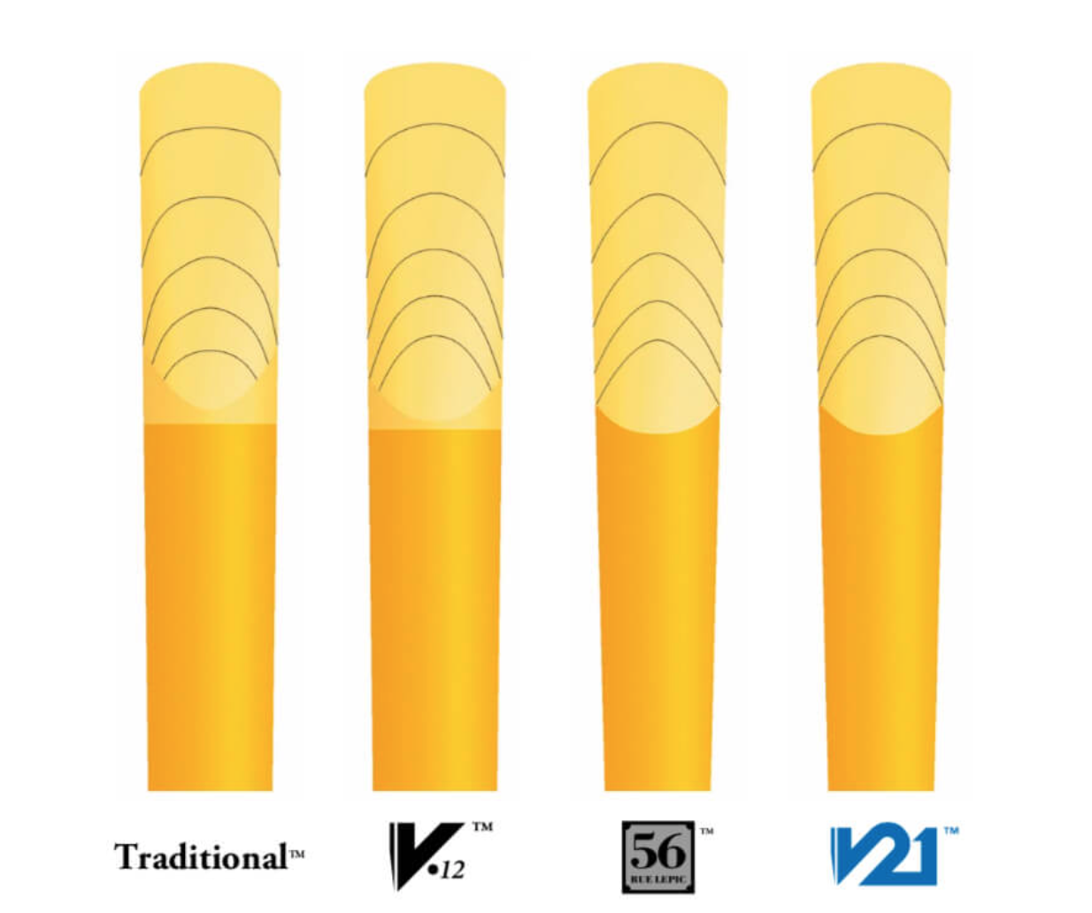 Plátky V.12 se vyrábějí z třtinových trubic stejného průměru, jako třtina používaná pro altsaxofonové plátky. V důsledku toho mají tlustší patu a jsou seříznuty na delší paletu s mírně tlustší špičkou než Traditional. Delší paleta způsobuje, že vibruje více plátku a výsledkem je hlubší a plnější zvuk. Tlustší špička přidává tělu ozev a také prodlužuje životnost plátku. Při porovnání síly je síla plátku 4 téměř stejná jako u Traditionalu síla 3 1/2.