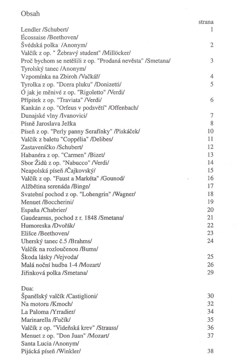 Lendler (Schubert)Écossaise (Beethoven)Švédská polkaValčík z op. "Žebravý student" (Millöcker)Proč bychom se netešili z op."Prodaná nevěsta" (Smetana)Tyrolský tanecVzpomínka na Zbiroh (Vačkář)Tyrolka z op. "Dcera pluku" (Donizetti)Ó jak je měnivé z op. "Rigoletto" (Verdi)Přípitek z op. "Traviata" (Verdi)Kankán z op. "Orfeus v podsvětí" (Offenbach)Dunajské vlny (Ivanovici)Písně Jaroslava JežkaPíseň z op. "Perly panny Serafínky" (Piskáček)Valčík z baletu "Coppélia" (Delibes)Zastaveníčko (Schubert)Habanéra z op. "Carmen" (Bizet)SborŽidů z op. "Nabucco" (Verdi)Neapolská píseň (Čajkovský)Valčík z op. "Faust a Markéta" (Gounod)Alžbetina serenáda (Binge)Svatební pochod z op. "Lohengrin" (Wagner)Menuet (Boccherini)Espaňa (Chabrier)Gaudeamus, pochod z r.1848 (Smetana)Humoreska (Dvořák)Elišce (Beethoven)Uherský tanec č.5 (Brahms)Valčík na rozloučenou (Bums)Škoda lásky (Vejvoda)Malá noční hudba 1-4 (Mozart)Jiřinková polka (Smetana)Španělský valčík (Castiglioni)Na motoru (Kmoch)La Paloma (Yrradier)Marinarella (Fučík)Valčík z op. "Videňská krev" (Strauss)Menuet z op. "Don Juan" (Mozart)Santa LuciaPijácká píseň (Winkler)
