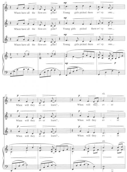 Krásná a známá melodie, která se u nás zpívá pod názvem "Řekni, kde ty kytky jsou?" v příjemné úpravě pro 3 vysoké (soprán) hlasy s doprovodem klavíru.