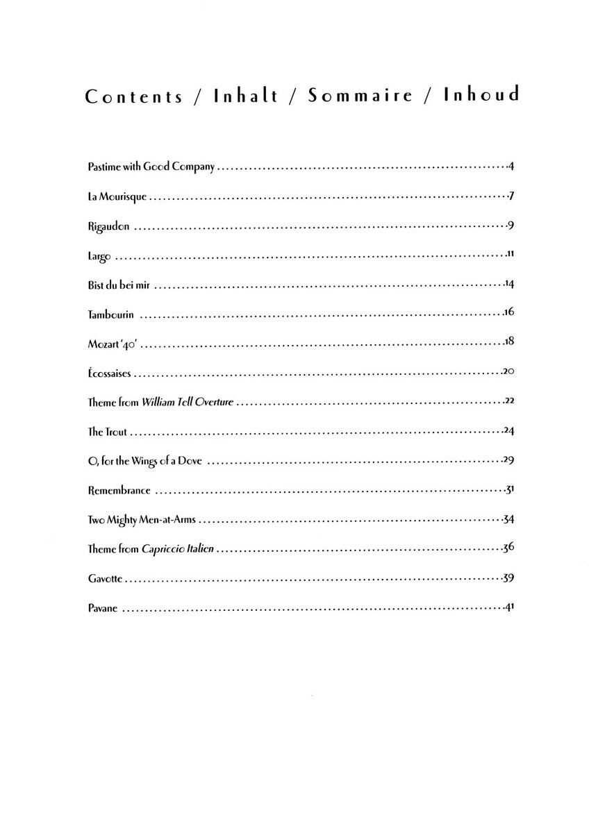 Bist Du Bei Mir - If Thou Art Near (Stolzel/Bach)Ecossaises (Beethoven)Gavotte from Holberg Suite (Grieg)La Mourisque (Susato)Largo from Xerxes (Handel)Mozart '40' from Symphony No.40 (Mozart)O, For The Wings Of A Dove (Mendelssohn-Bartholdy)Pastime With Good Company (Henry VIII)Pavane Op.50 (Faure)Remembrance - Erinnerung Op.68 No.28 (Schumann)Rigaudon (Purcell)Tambourin (Gossec)The Trout from String Quartet Op.114 (Schubert)Theme From Capriccio Italien (Tchaikovsky)Theme From William Tell Overture (Rossini)Two Mighty Men-at-Arms from La Belle Helene (Offenbach)