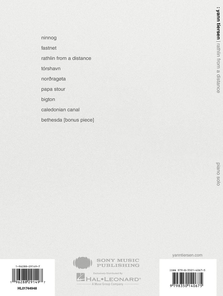 Sbírka klavírních skladeb „Rathlin from a Distance“ je pojmenovaná podle ostrova Rathlin v Severním Irsku. Sbírka Vám přináší osm přednesových klavírních skladeb, které Yann Tiersen napsal podle míst, které navštívil při své plavbě v roce 2023. Od majáku Fastnet v Atlantickém oceánu přes Faerské ostrovy a Shetlandy až po klidné vody Kaledonského kanálu ve Skotsku. Každá skladba je pojmenována podle místa, které Tiersen navštívil, a jejich hra vytváří klidnou až hypnotickou atmosféru. Sešit obsahuje navíc bonusovou skladbu „Bethesda“ a je vytištěn na vysoce kvalitním nenatíraném papíře a předmluvu v sešitě napsal sám Yann Tiersen.